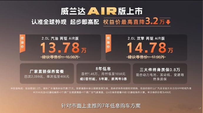 最近这两年整车的价格持续在降价,但是不知道大家发现了没有,那就是养车成本,特别是电池、发动机、变速箱等三大件的维修和更换成本,仍然是比较高的,不过广汽丰田的全新威兰达AIR版却为广大用户提前考虑到了这个问题,主打一个厂家给你兜底,为大家进一步排除了养车的成本,发动机、变速箱还有电池,都是终身质保,换句话说就是你只管开,出了问题广丰给你负责,再加上起步即高配,权益价最高直降3.2万,全新威兰达AIR版直接位用户实现“三不”,不用妥协配置,不用操心养车,不用承担高价,这真是无顾虑高品质出行了!广汽丰田发布厂家直销保养套餐