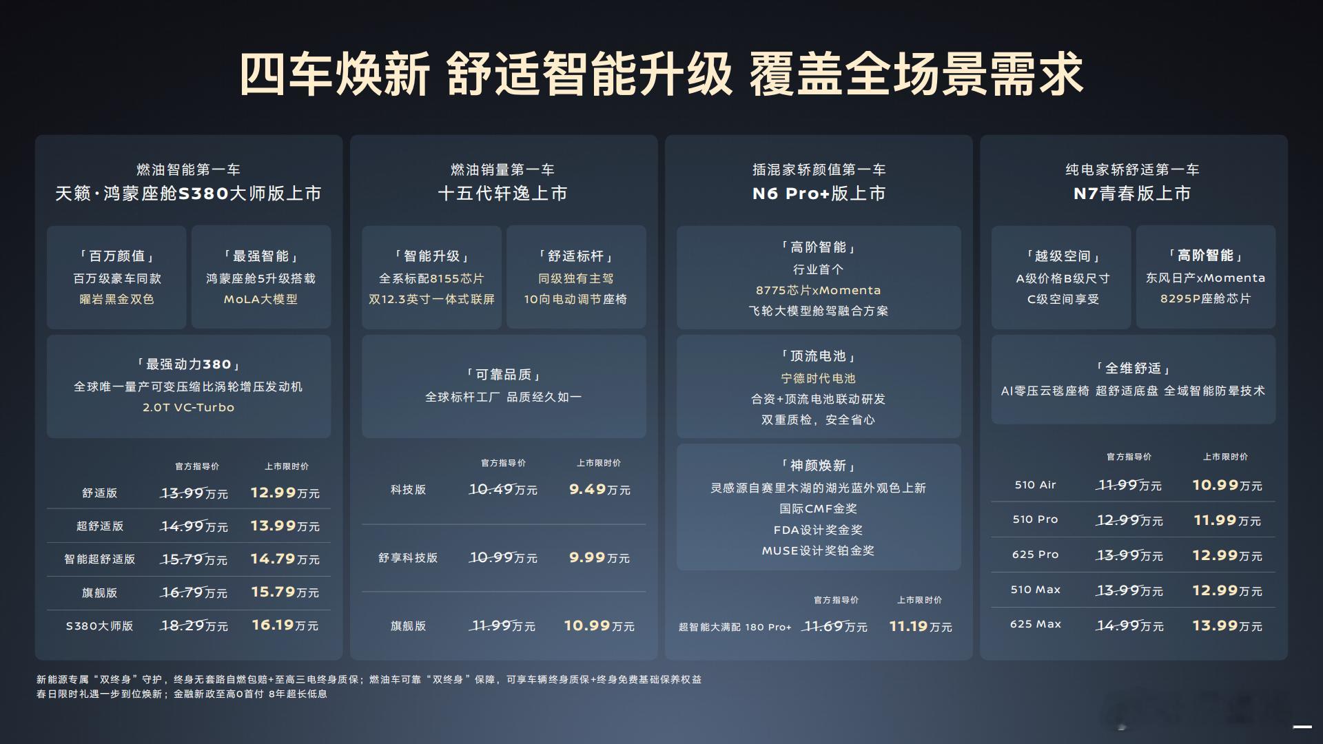 初八开工,东风日产四车齐发!第十五代轩逸、天籁·鸿蒙座舱S380大师版N6 180 Pro+版、N7青春版,共四款新车上市新年新气象东风日产这开年,就要定义家轿价值新标准了!🍔十五代轩逸,3款车型,9.49—10.99万天籁·鸿蒙座舱S380大师版,16.19万N6 180 Pro+,11.19万N7全系焕新青春版,10.99—13.99万四款车型,可以说精准触达到不同的人群面不管是油还是电,总能找到自己喜欢的一款🍔质保政策上N6跟N7是终身无套路自燃包赔及三电终身质保权益天籁全系跟十五代轩逸,可享终身免费保养服务天籁全系可享整车终身质保,轩逸全系可享动力总成终身质保可以说基本也是拉满了🍔购车政策上“至高0首付8年超长低息”限时购车享至高19000元装备礼等等新年有需要的,可以赶紧去店里看看了!汉堡杨大v聊车 吉安