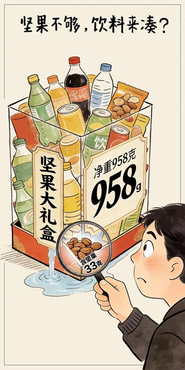 节日里走亲访友,总得带点伴手礼,但一款标称958克的“坚果大礼盒”,拆开一看,660克是饮料,真正的坚果只有33克——坚果成了点缀,饮料零食倒成了主角,这已不是个例。这种行为看似精明,实则是自毁招牌。消费者买“坚果礼盒”,冲的就是坚果,结果商家用低成本商品“注水”,已明显涉嫌虚假宣传。