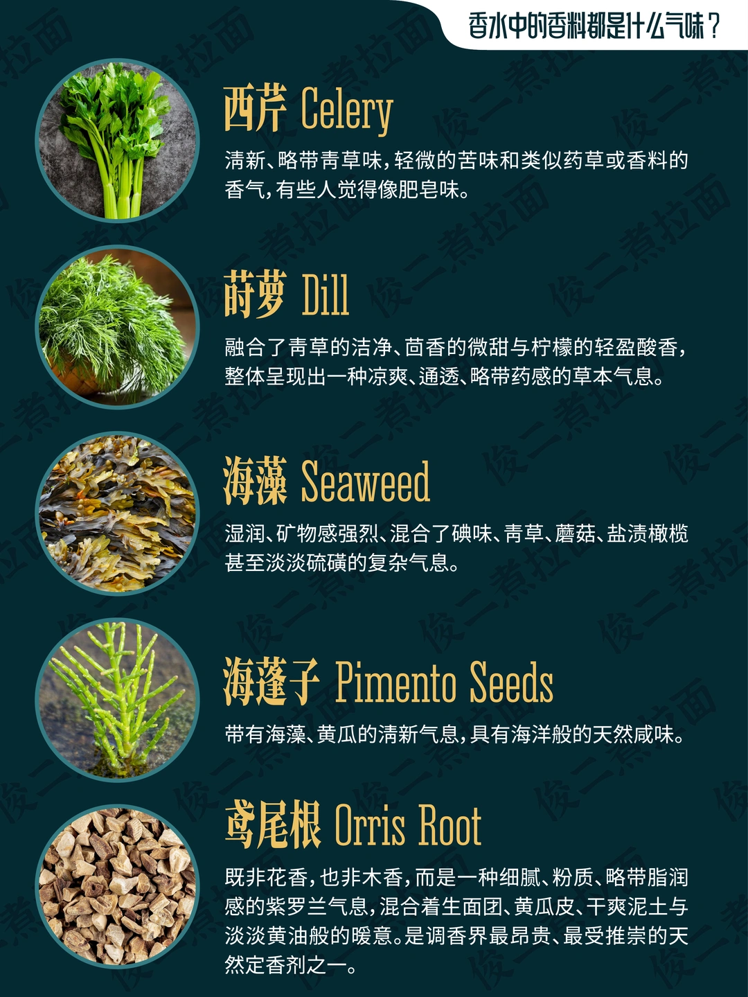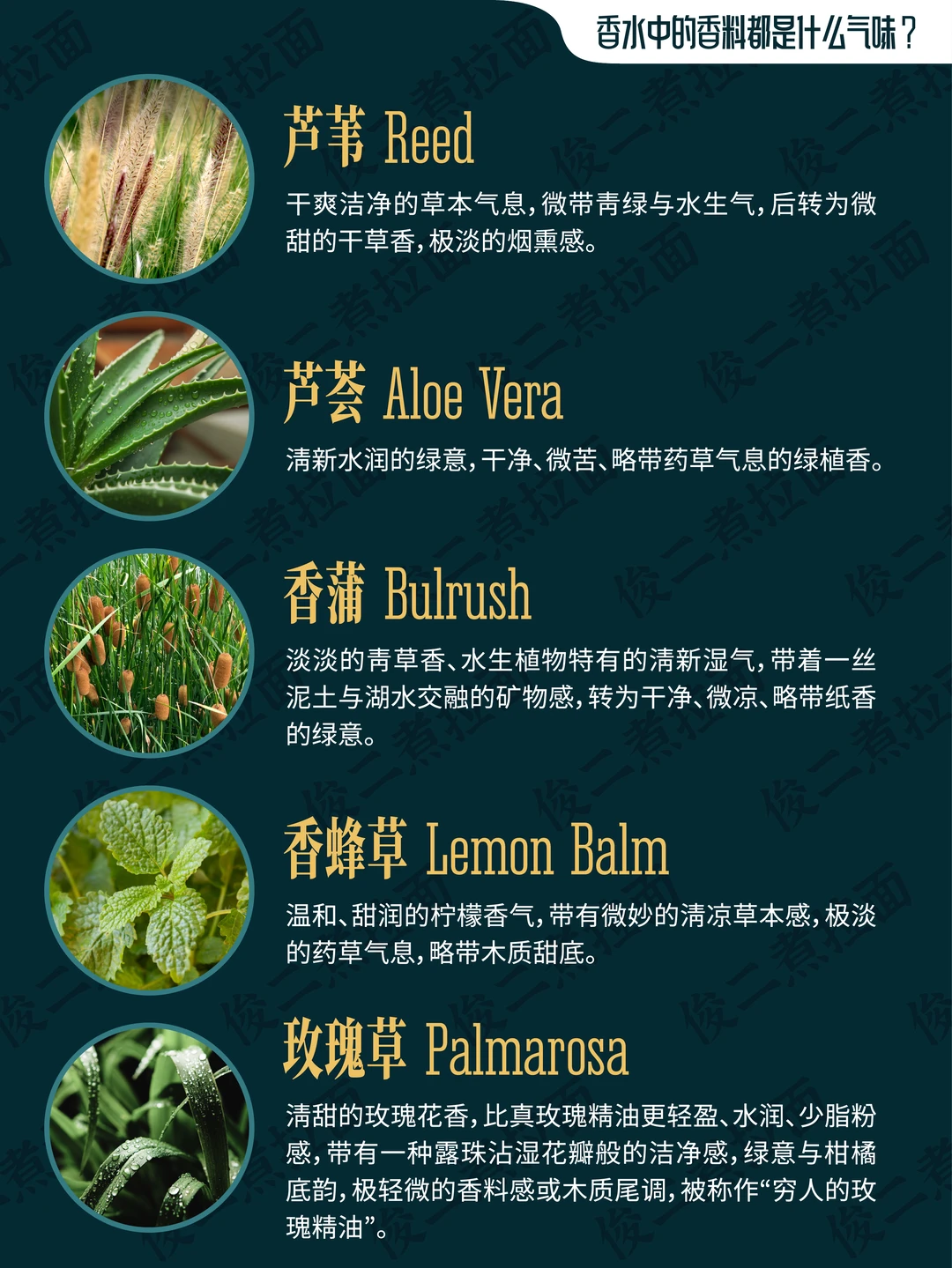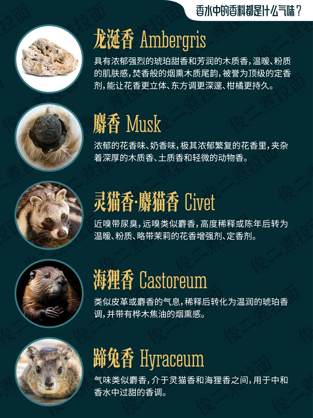 麝香 龙涎香 麝猫香 海狸香 蹄兔香 蜂蜜 蜂蜡 羊毛 皮革 黄葵·麝香秋葵 欧白芷·天使草 白芷 甘草 当归 烟草 雪茄 广藿香 橙花油 肉桂油 卡南加 鸢尾根 海蓬子 海藻 莳萝 西芹 甘松香 啤酒花 荨麻 甜菜根 芦苇 芦荟 蔓藤 香蜂草 玫瑰草 香蒲 马郁兰 牛至叶 蕨类植物 人参 山丝苗 万绍龙 胡萝卜 胡萝卜籽
