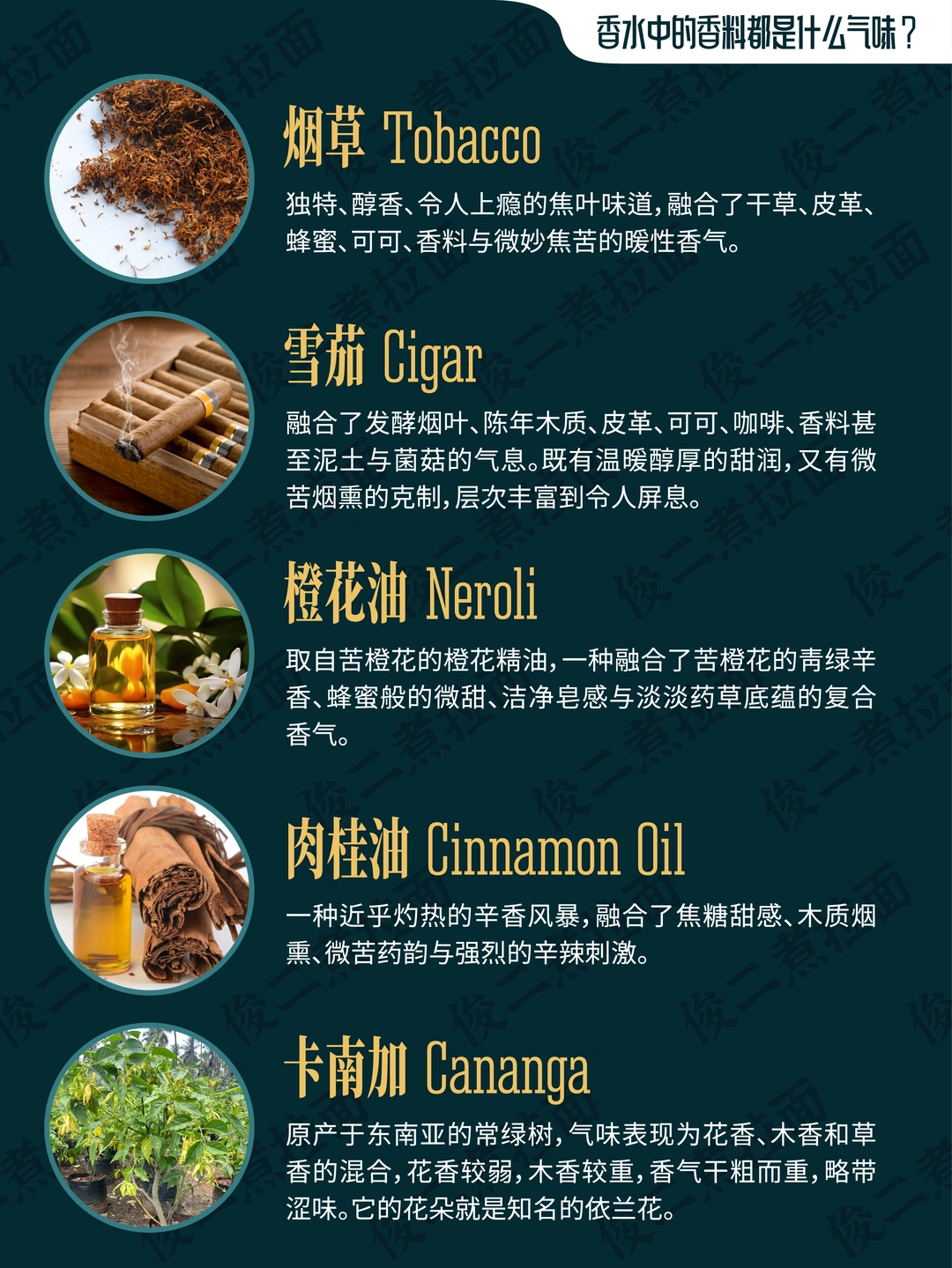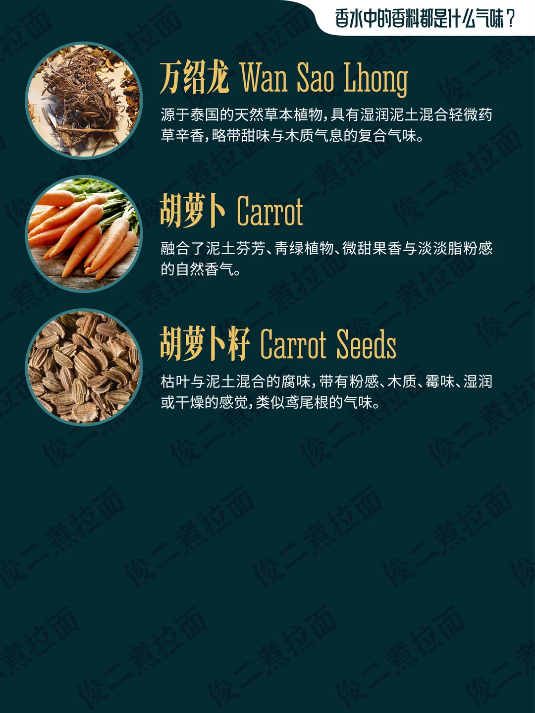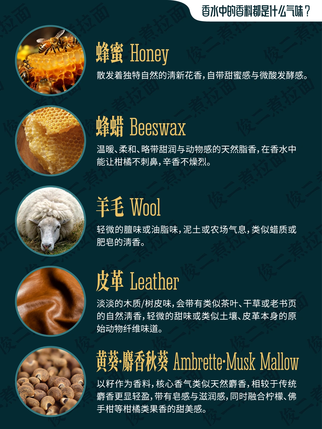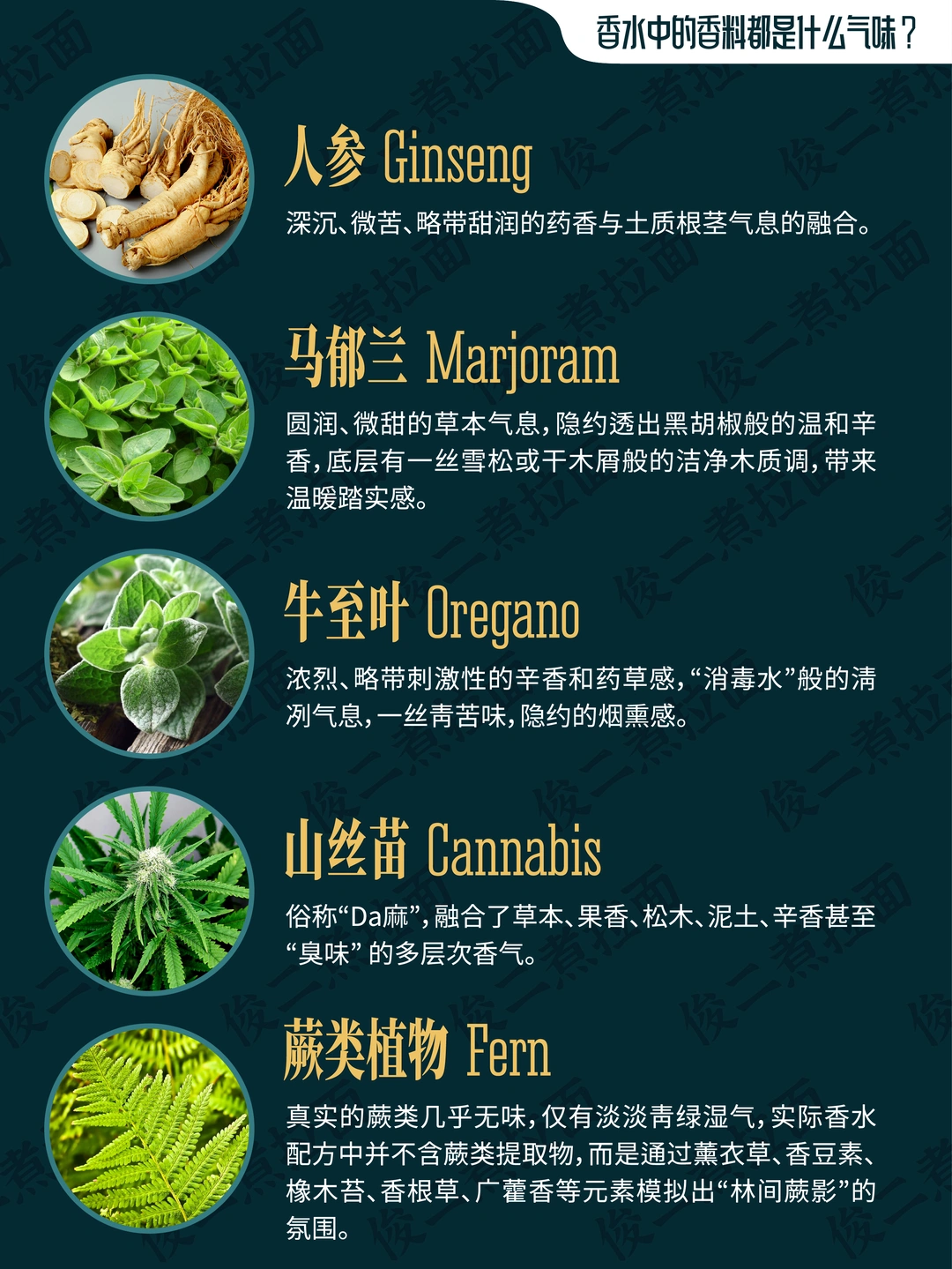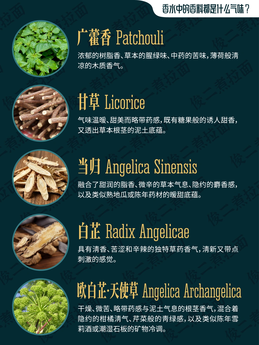 Musk,Ambergris,Civet,Castoreum,Hyraceum,Honey,Beeswax,Wool,Leather,Ambrette·Musk Mallow,Angelica Archangelica,Radix Angelicae,Licorice,Angelica Sinensis,Tobacco,Cigar,Patchouli,Neroli,Cinnamon Oil,Cananga,Orris Root,Pimento Seeds,Seaweed,Dill,Celery,Jatamansi·Spikenard,Hops,Nettle,Beetroot,Reed,Aloe Vera,Vine,Lemon Balm,Palmarosa,Bulrush,Marjoram,Oregano,Fern,Ginseng,Cannabis,Wan Sao Lhong,Carrot,Carrot Seeds