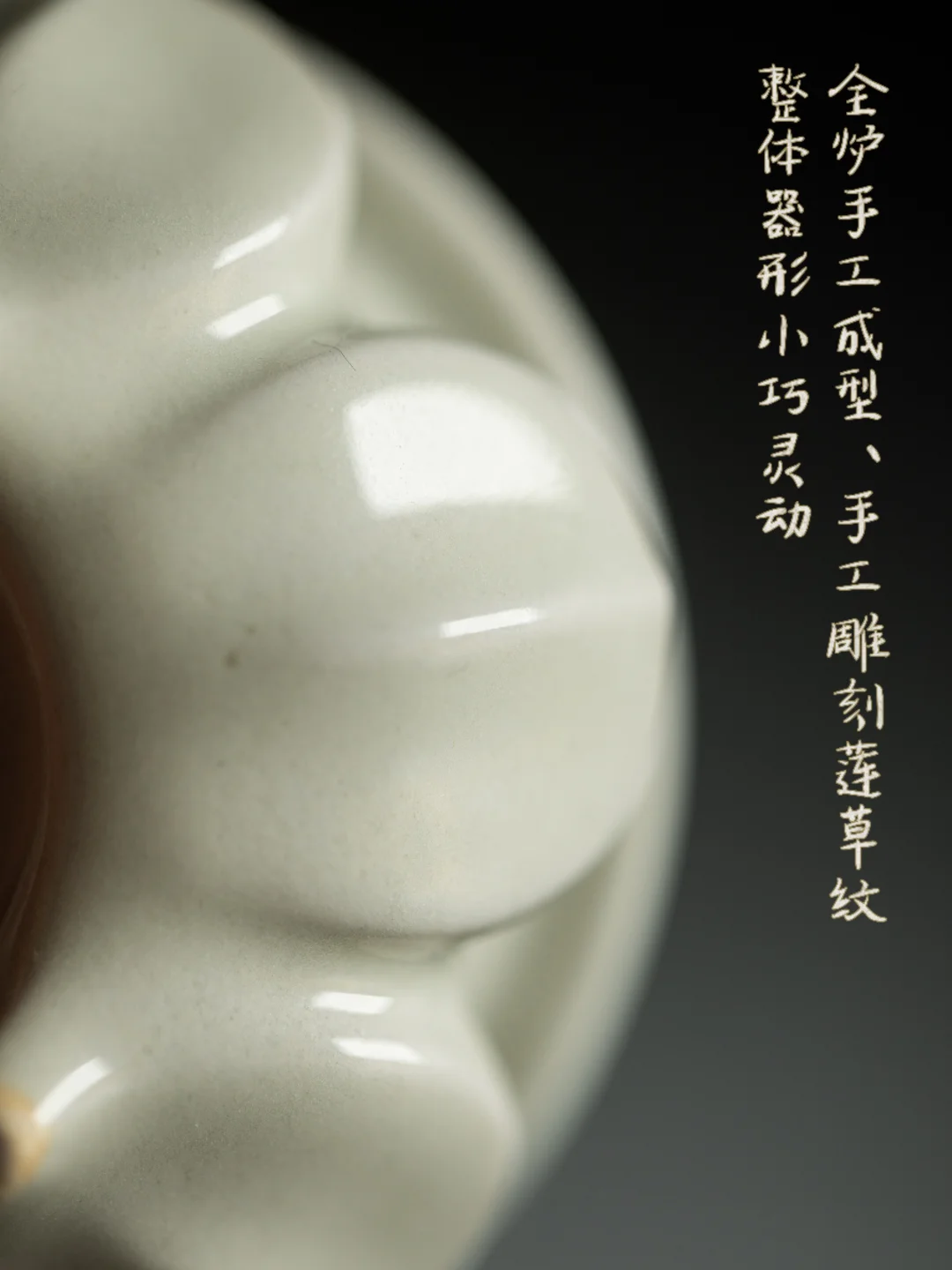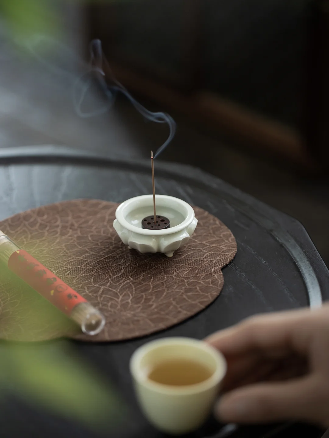 它很小,放在茶席一角,几乎不占地方。莲草纹清雅,草木灰釉温润。点一枚小香片,烟气若有若无,刚好够得着鼻尖,却又不扰茶香。