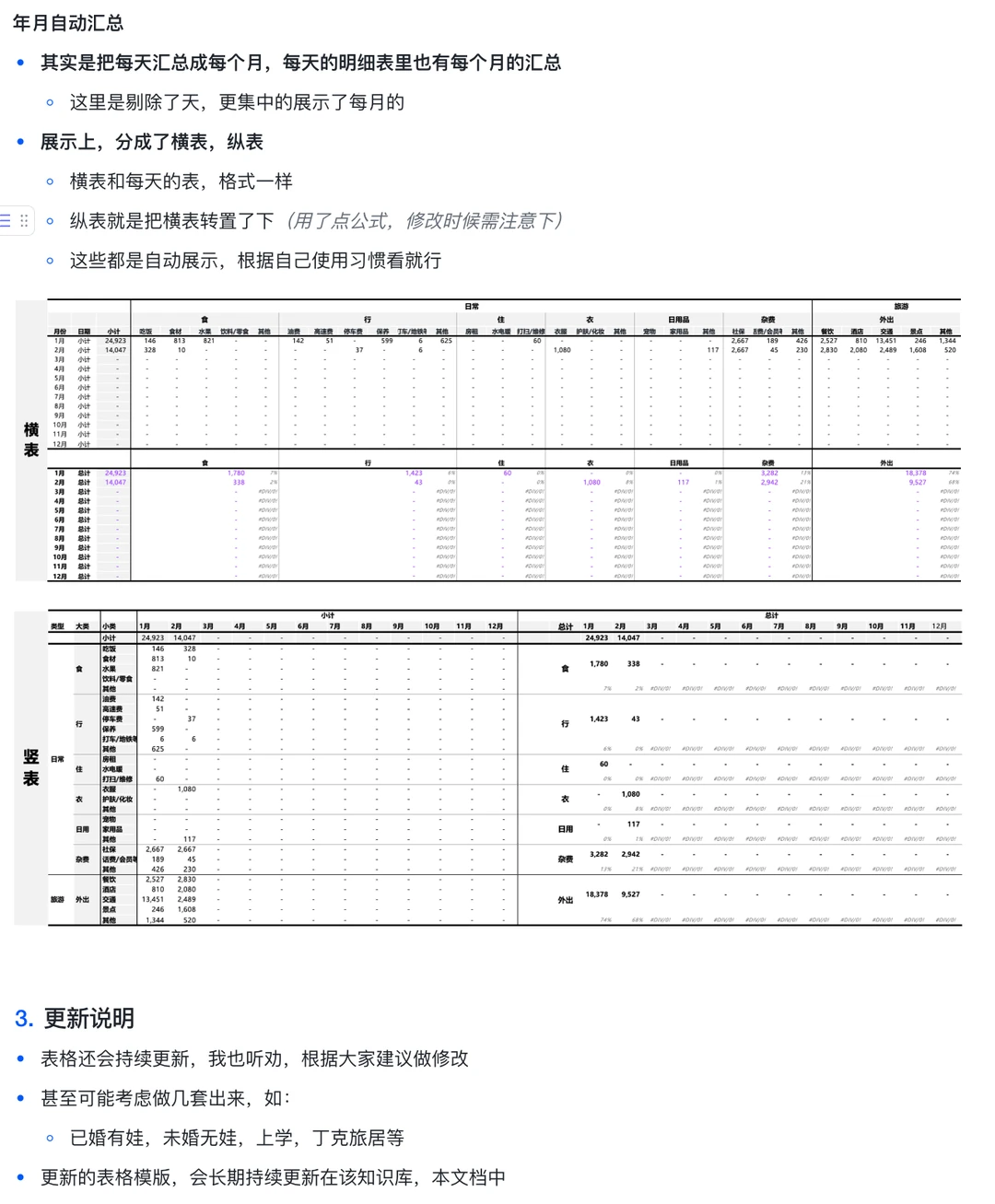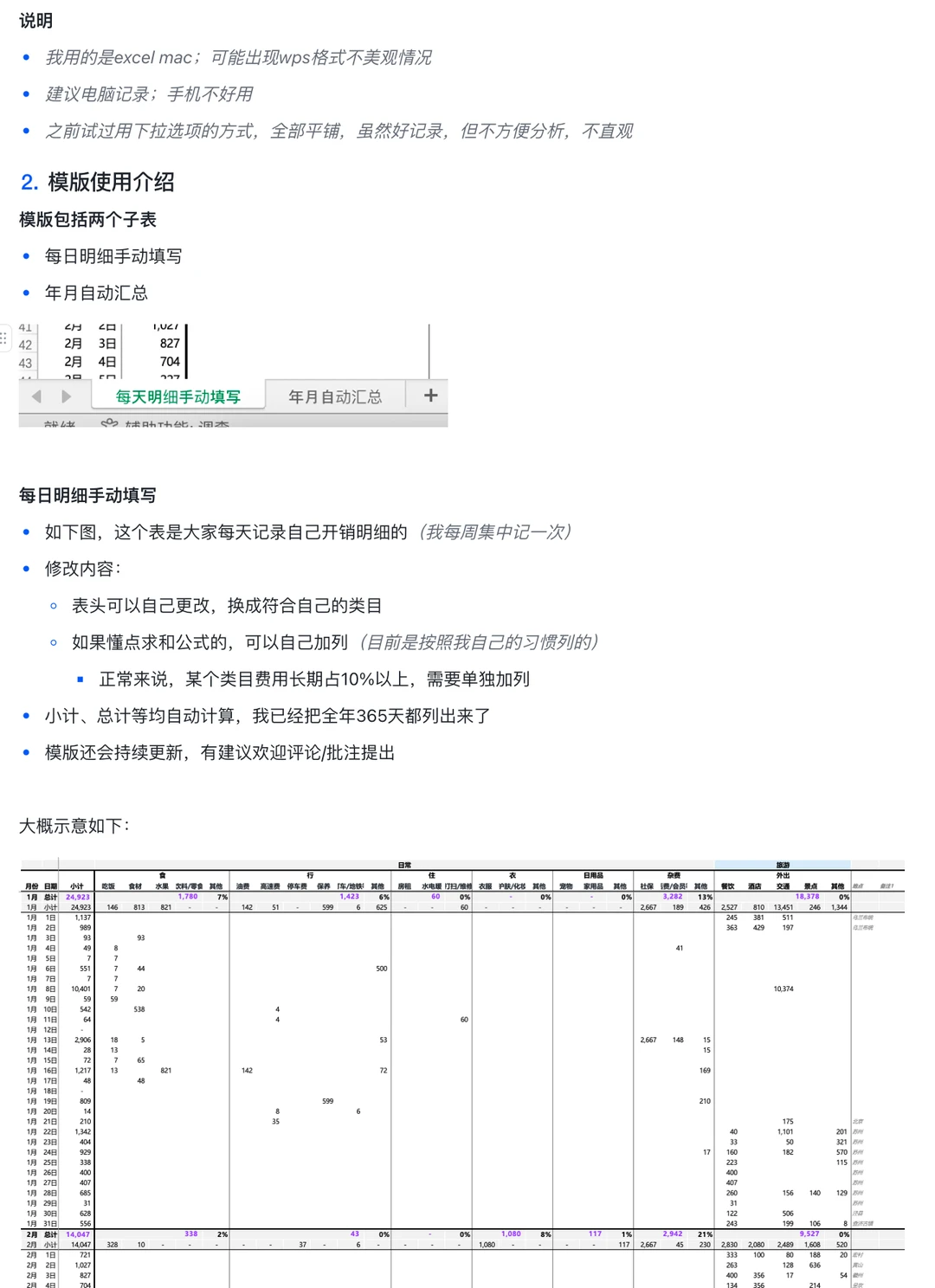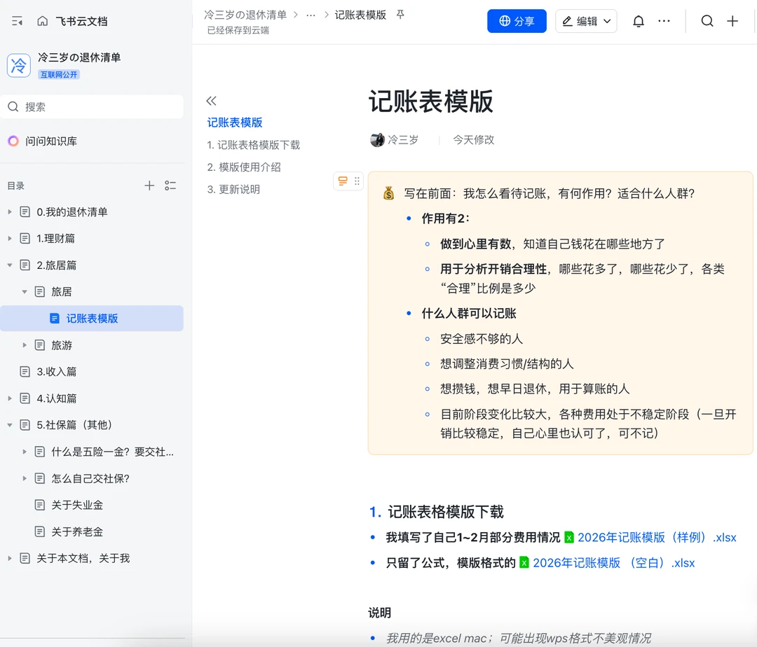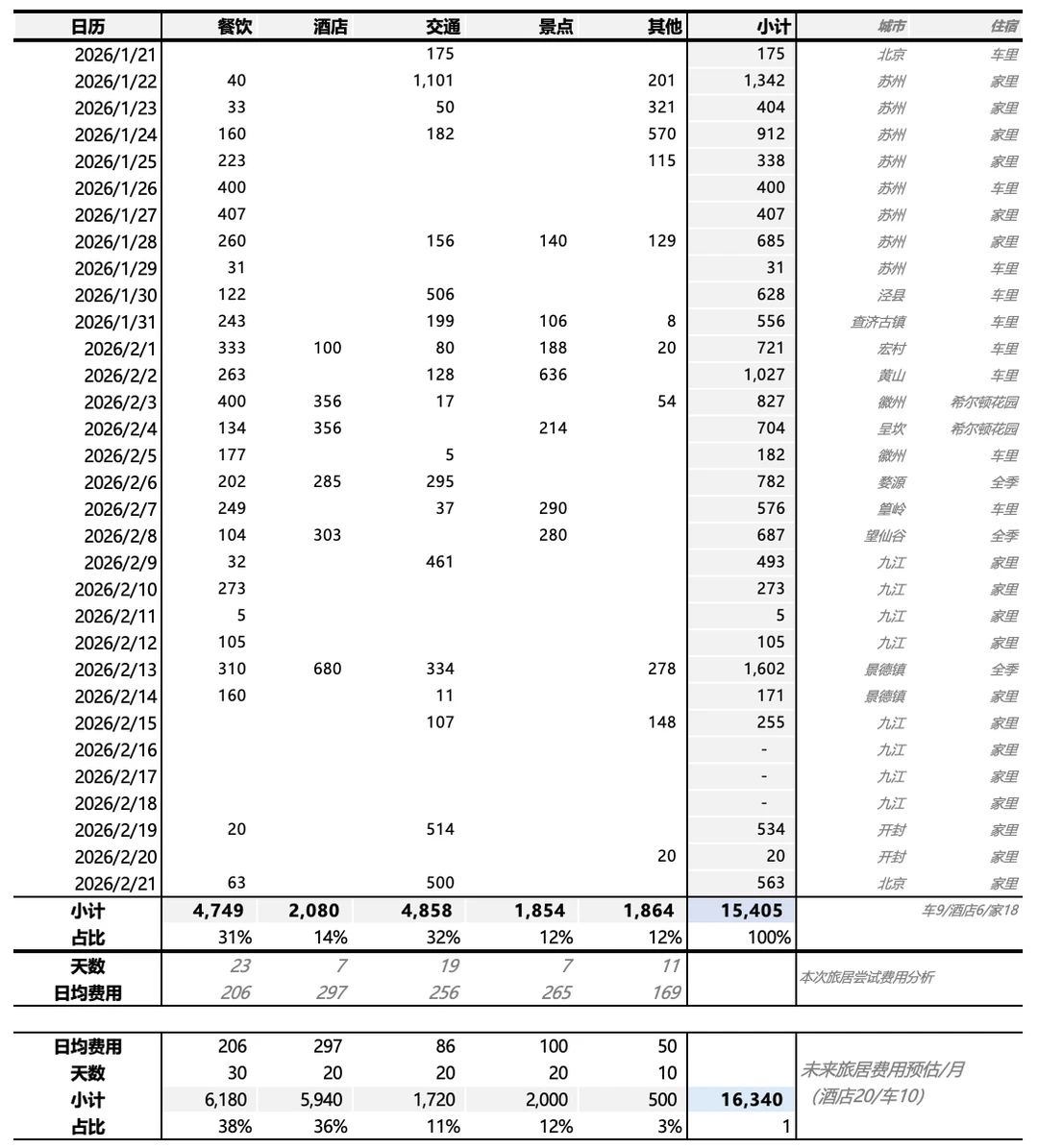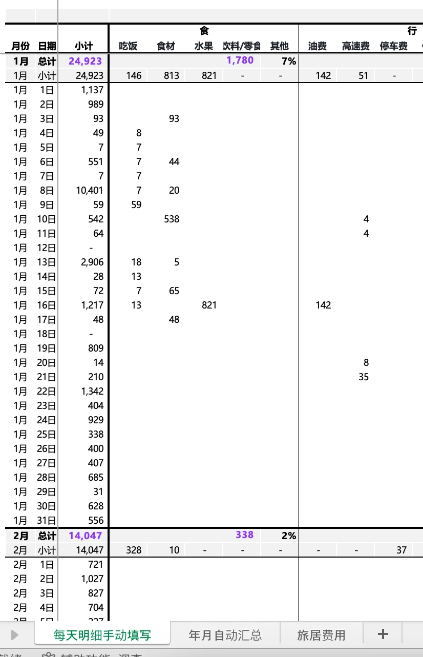 其实很早之前我是“不屑于”记账的 因为自己足够“直男” 对自己的开销了如指掌 没对象之前,除了车的、房子的费用 可能自己一个月一两千就可以了 但实际上一年也要花二三十万(用爸妈的话就是没存下来钱) 后来想早点不上班,退休 想知道都有哪些地方花钱 要花多少钱 那我要存多少钱 每个月/天需要多少被动收入才行 从去年下半年开始陆续记账 刚过完年,回到北京 而且试了一个月的旅居尝试 对一些开销更有了解了 就想着把这个记账的模版分享出来 图1:是我1~2月费用汇总情况 图2:是部分明细记录(会自动求和,归类,汇总 图3~5:是关于模版说明,介绍 (什么人需要记账,记账目的是啥,也写在图2了 图6:是我最近一个月旅居费用情况 PS.我和对象是分开记账的,各自的表 每个月会对下大帐,知道整体开销如何 其中旅游部分会拟合一起 日常各自开销互不相管 PS.想简单说两句旅居的事儿 这次出去30天 旅游直接相关的花了1.5万 大头是吃饭和交通 主要这次跑得比较多,大概有5000公里了 从北京去了苏州、黄山、景德镇、上饶、九江、开封(以后旅居就不会跨区域跑了) 住宿上没咋花钱,在三个地方都住家里了,还有时候睡车里了 大概细拆了下 预估未来旅居一个月1.6万是差不多ok的 一个月去2~3个市差不多 工作日出来玩,周末躺着休息