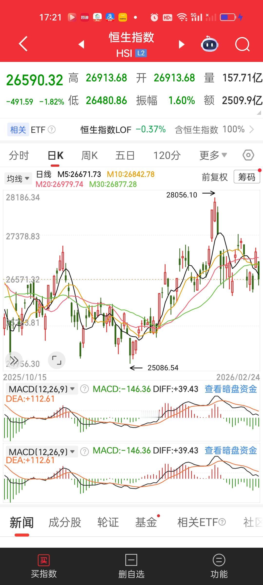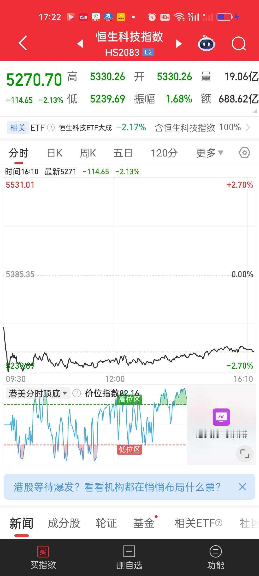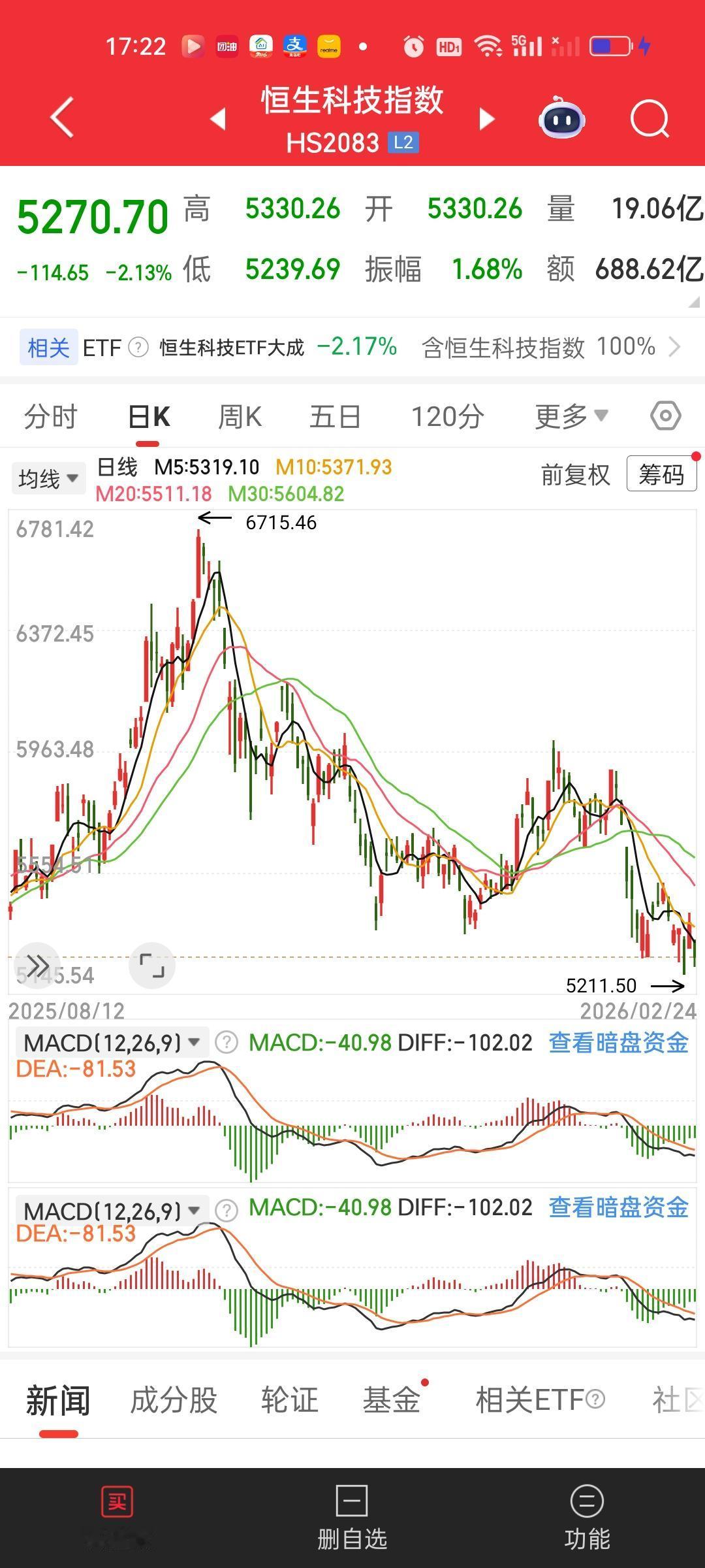 港股这个地方还是需要耐心,收盘两大指数依旧收在所有均线下方,目前盘面有走的比较弱势。5239.69/6715.46=0.7802,恒科今天最低点距离前高已经跌了22%, 还是那个问题加仓不要加太快。小涨小跌不用管,大跌就加,大涨就把低位加进去的卖出,来回不停地做,把成本做的越来越低。就这样放着,肯定比存银行定期要强。但你总是想着一把梭哈吃肉,那肯定不会有好的心态和结果。