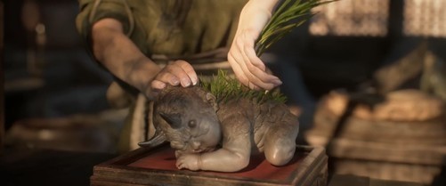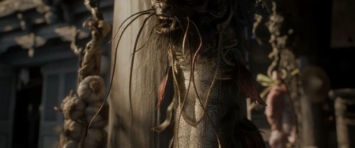 《南山经》载:“青丘之山……英水出焉,南流注于即翼之泽。其中多赤鱬,其状如鱼而人面,其音如鸳鸯,食之不疥。”短片中第一个出场的即是此物,传说食之可避疫病。