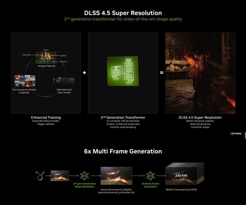 参照《黑神话:悟空》的实测,DLSS4多帧生成技术将成为流畅运行的关键,索泰RTX50系列显卡利用AI可为每个渲染帧额外生成多达3帧,(在不久后可生成多达5帧)。最新的DLSS4.5超分辨率技术更是将画面细节提高到了一个令人赞叹的地步,而今年春季,6倍动态帧生成技术也将正式上线,届时游戏体验将更上一个台阶。