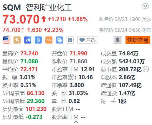 昨日收涨1.68%的智利矿业化工(SQM.US)今日美股盘前续涨2.23%,报74.7美元。消息面上,在全球供应过剩局面逐步缓解之际,智利矿业化工与智利国家铜业公司(Codelco)的锂业合作项目去年生产的锂略高于此前预测。据悉,双方的合资企业NovaAndinoLitioSpA在2025年生产了23.3万吨碳酸锂当量,这一产量高于2024年水平,也略高于智利矿业化工在去年11月给出的“接近23万吨”的最新指引。(格隆汇)