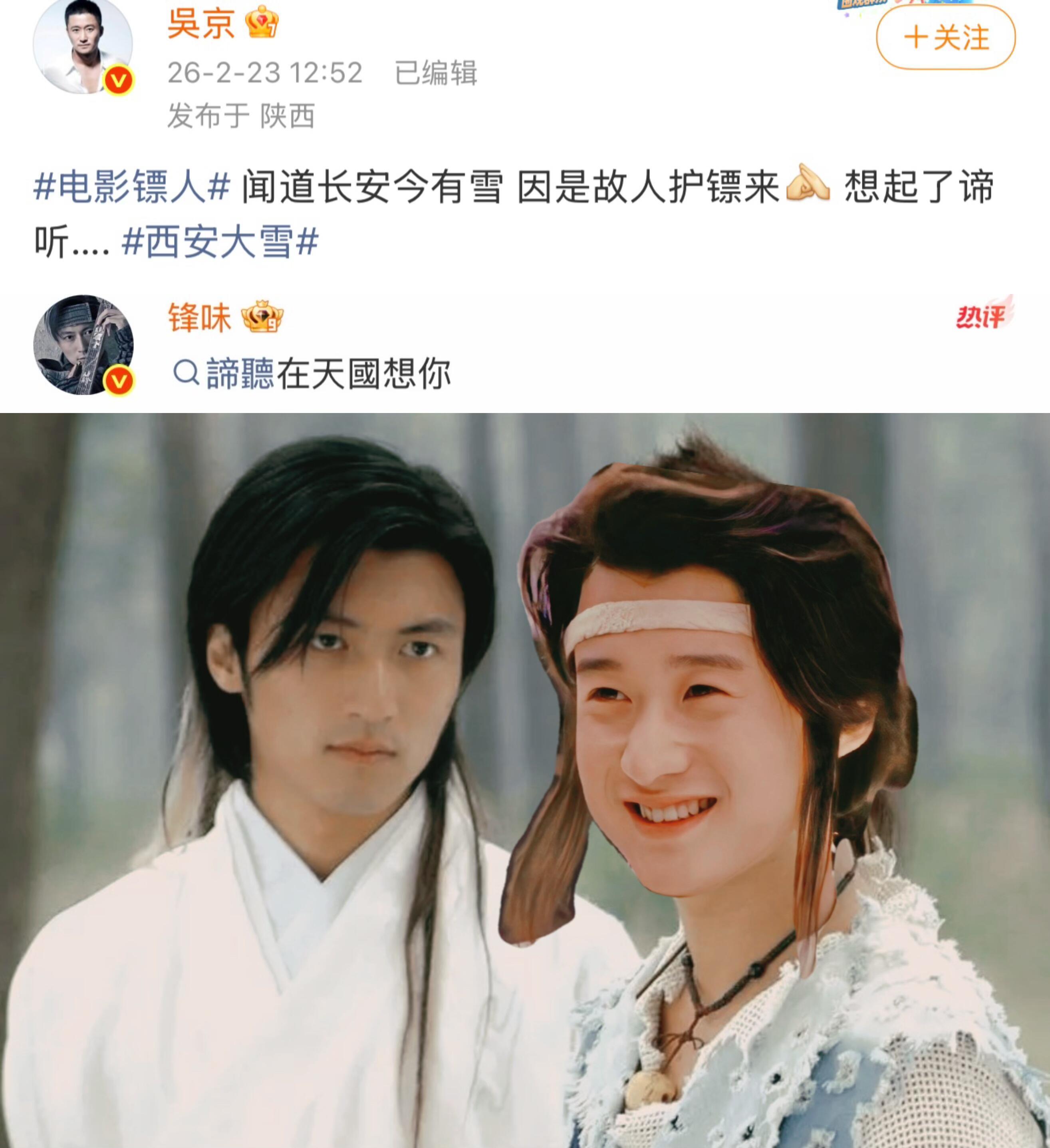 谢楠领嗑吴京谢霆锋谢楠转发了西安大雪的报道,配文:“可惜谛听再也看不到长安的雪了”吴京发“闻道长安今有雪 因是故人护镖来想起了谛听….”谢霆锋回复“谛听在天国想你”我:嗑鼠我了!
