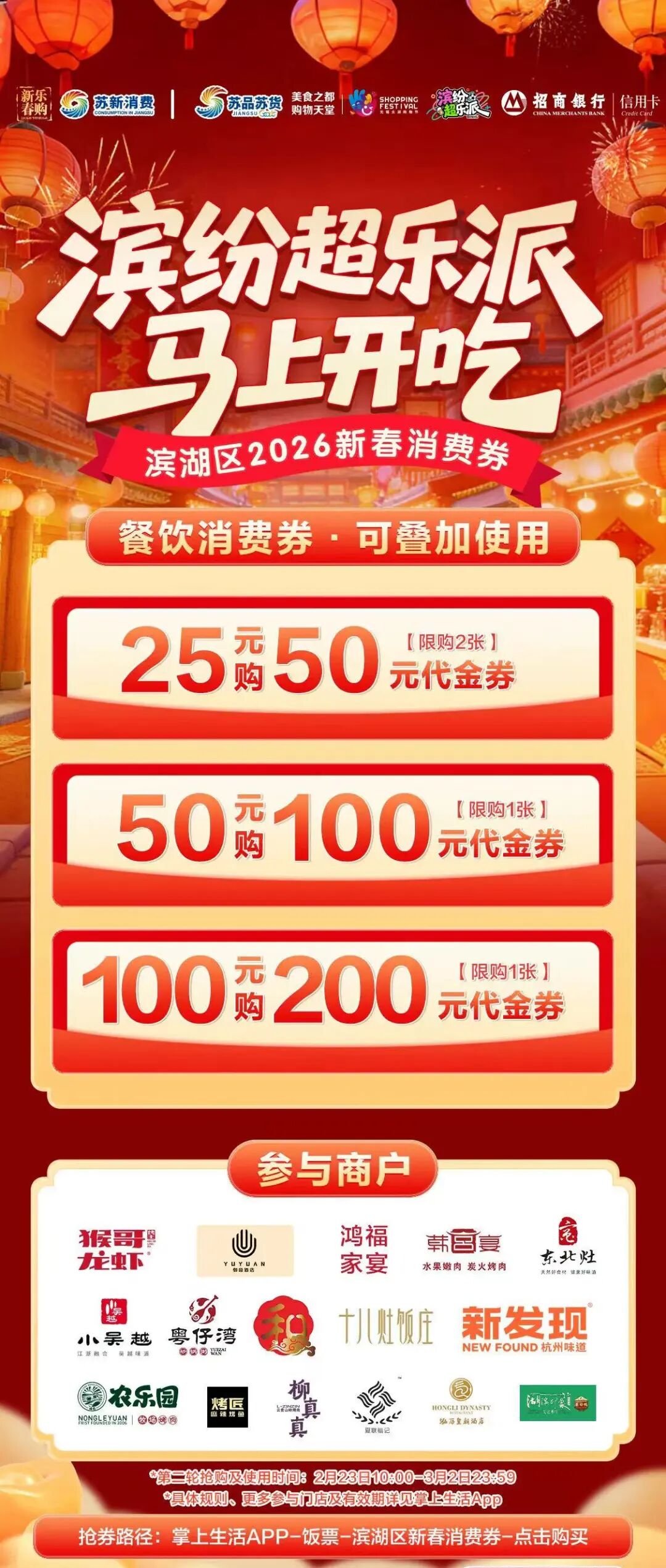 刚刚过去的春节假期,为充分激活消费市场,“欢喜无锡快乐Go”滨湖新春消费季火热开启。2月12日,首轮“滨纷超乐派·马上开吃”餐饮消费券正式推出,涵盖“25元抵50元、50元抵100元、100元抵200元”三种面额,精准覆盖春节假期。第二轮消费券于2月23日正式发放,使用期限为2月23日—3月2日,实现春节至元宵节消费场景全覆盖,持续为商圈引流聚客。
