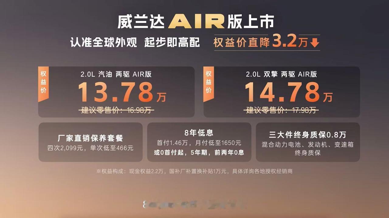 【限时权益价13.78万起,广汽丰田威兰达Air版上市】2月24日,广汽丰田发布全新换代威兰达AIR版,并推出新春大礼包,2.0L汽油Air版权益价13.78万元、2.0L混动Air版14.78万元。威兰达于2025年12月完成换代,指导价区间为16.98万-23.08万元,其外观换装全新设计,前脸弱化了前格栅的存在,采用无边框的蜂窝造型。车身尺寸方面,其长宽高分别为4600/1855/1680mm,轴距2690mm。车内配备15.6英寸中控屏,支持手势控制、智能语音以及CarPlay、HiCar、Carlink手机互联,另外其还会配备TSS 4智驾(辅助)系统,涵盖低速场景行驶辅助、高速场景巡航辅助、预碰撞安全辅助、泊车辅助等多项功能。值得一提的是,入门版车型也会提供高级皮质座椅、外后视镜折叠加热、50W无线快充和64色氛围灯等配置。动力提供2.0L汽油、2.0L混动、2.5L混动三种动力,综合功率分别为126千瓦、144千瓦和174千瓦。两驱版车型标配LSD限滑差速器;四驱版车型搭载E-FOUR四驱系统,通过行星齿轮结构增大发动机功率驱动前桥电机,前后轮扭矩分配最高达20:80,后轮扭矩调节范围覆盖0:100。【来自懂车帝车友圈】