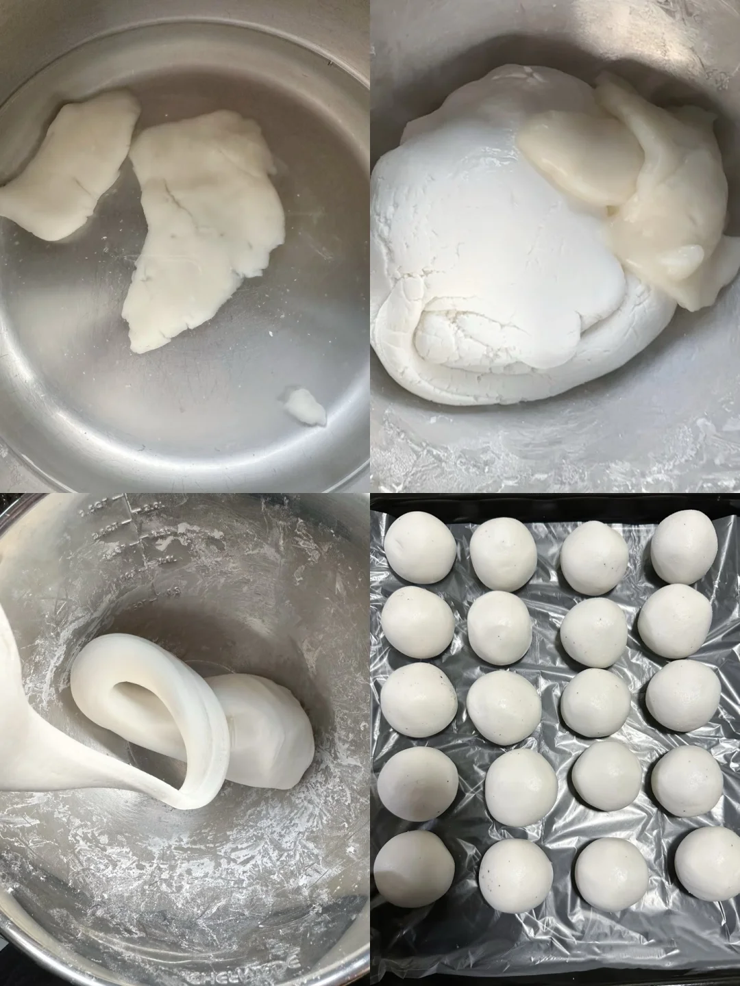 3️⃣从粉团中取十分之一,压扁,放水开水中煮至半透明熟透,过冷水,加入原粉团中揉均匀,揉至不粘手就可以了。