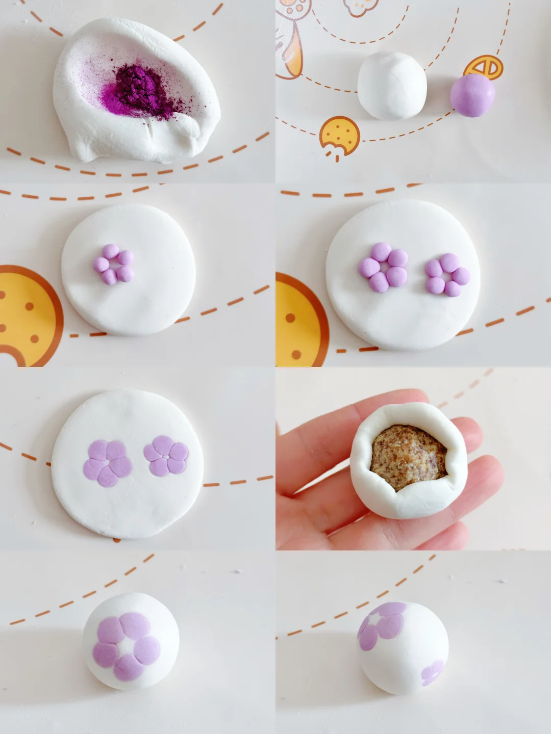 6️⃣取一个白色面团稍微压扁,再放上5个紫色面团,做两朵就放10个。再压扁,放上馅料包起来。包的时候其余的粉团需要盖保鲜膜防干!