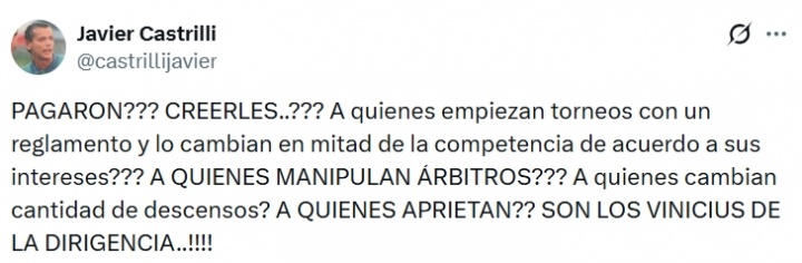 卡斯特里利首先言辞激烈地批评维尼修斯,他写道:“这个恶徒惯于挑衅、肆意羞辱、践踏、诋毁他人,煽动暴力,却倚仗着怯懦裁判的庇护,然后利用人性的愚昧,装作受害者进行自我辩护。大家都来相信这个极端觉醒文化下催生的怪胎吧。”