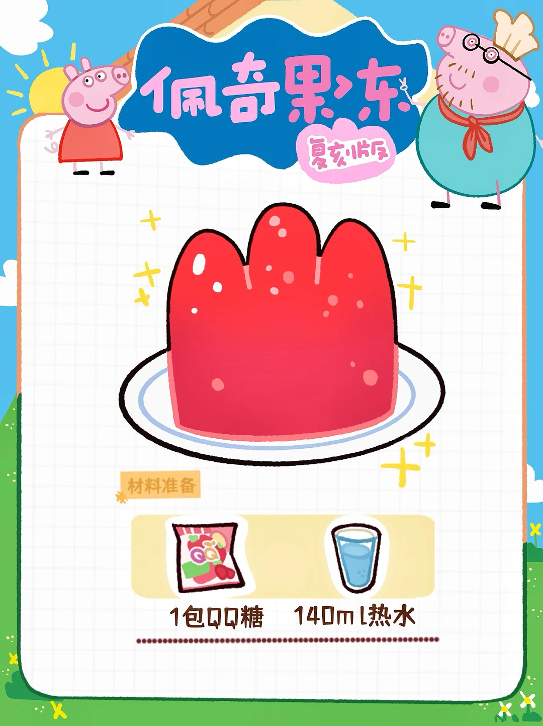 过年宅家复刻佩奇家同款果冻! 一起解锁小猪佩奇家🥳的快乐 谁懂啊家人们,真的巨巨巨简单 只要QQ糖+热水,2️⃣种材料就能复刻动画里的快乐 小猪佩奇果冻(复刻版) ⭐️食材准备 1包qq糖+140ml热水 ⭐️制作过程 1️⃣首先将1包QQ糖倒入杯中!加入140ml热水(比例的为2:1),搅拌均匀! 2️⃣倒入模具中!放进冰箱冷藏Z小时左右,小猪佩奇同款果冻就完成啦! 按照配方搅一搅,倒模具,冷藏2小时 QQ弹弹的佩奇脑袋就出炉啦!红通通的颜色超有年味🧧