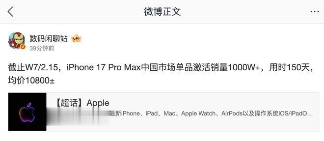 IT之家2月24日消息,博主@数码闲聊站今天在微博透露,截至2026年第七周/2月15日,苹果iPhone17ProMax手机中国市场单品激活销量突破1000万台,用时150天,均价10800±。