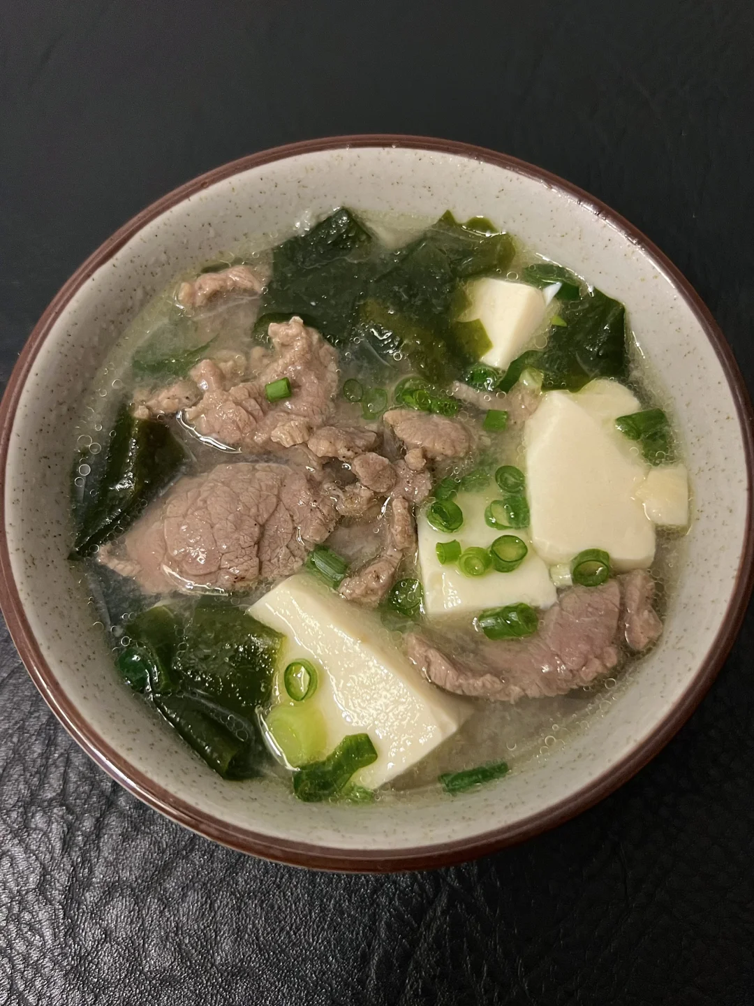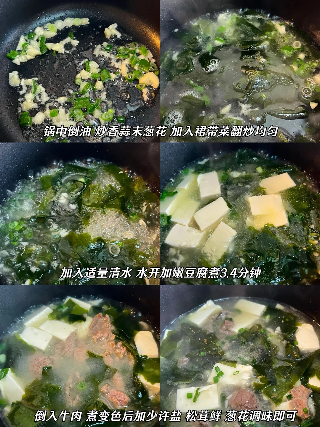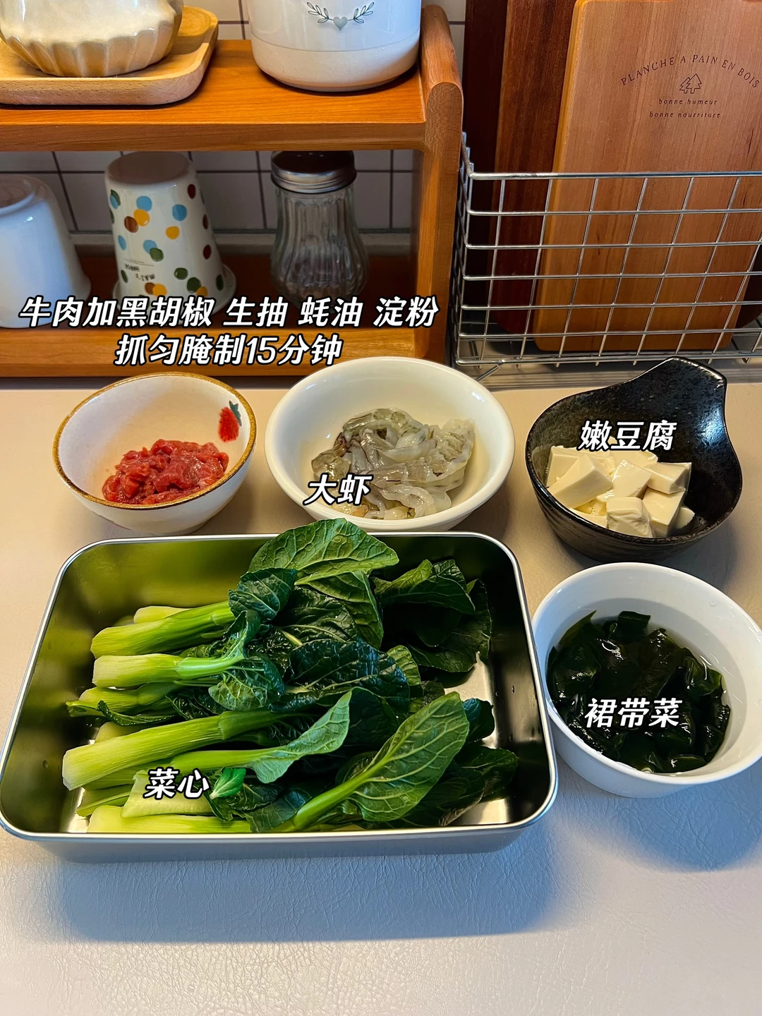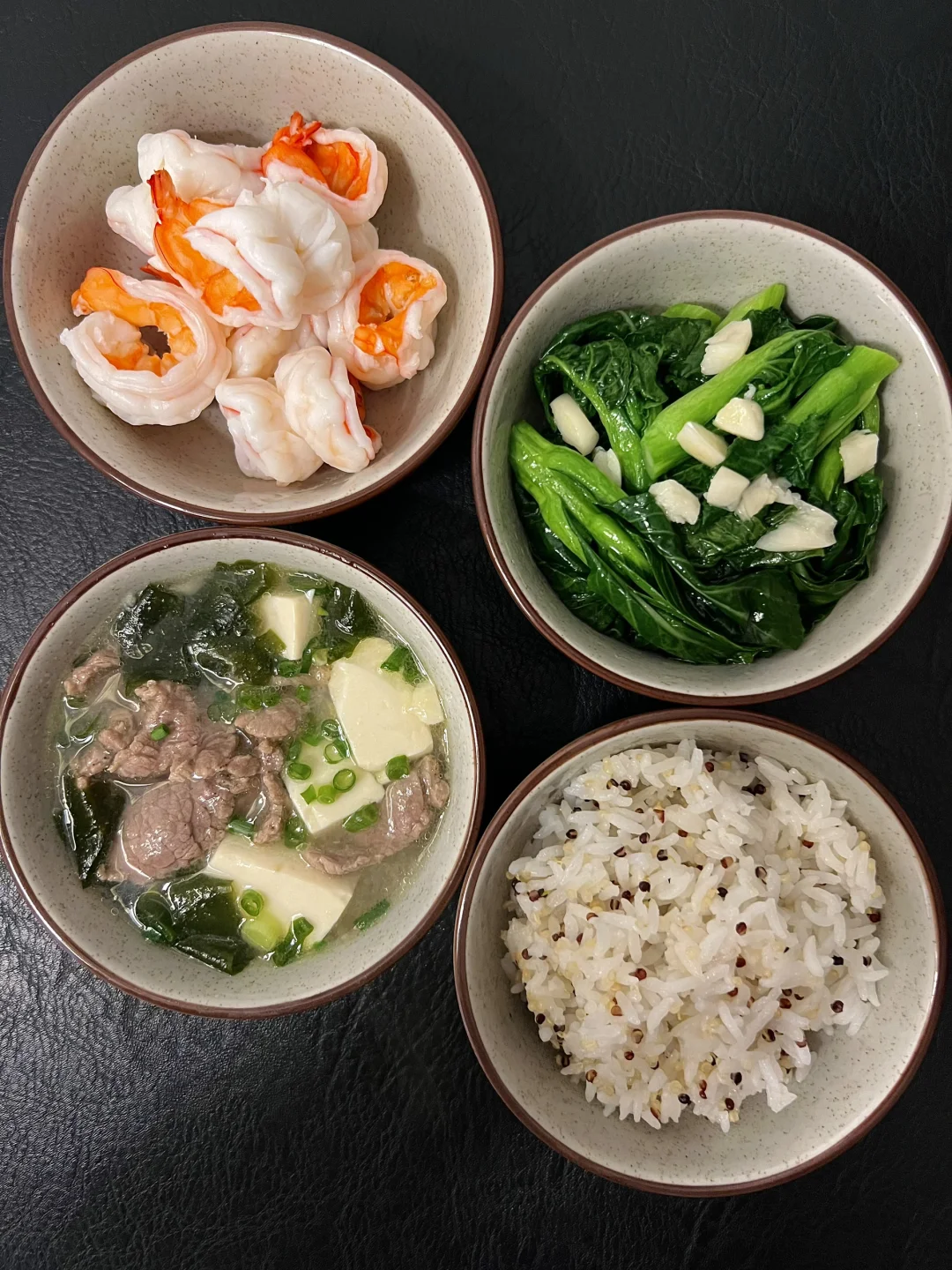 今日午餐:水煮虾仁+裙带菜嫩豆腐牛肉汤+清炒菜心🥬+杂粮饭 食材热量:约295千卡 水煮虾仁做法✅ ❶大虾开背处理干净 锅中加适量清水 葱段 姜片煮熟即可 裙带菜嫩豆腐牛肉汤做法✅ ❶牛肉切片加黑胡椒粉 生抽 红薯淀粉淀粉抓匀腌制15分钟 ❷锅中倒油 炒香蒜末葱花 加入裙带菜翻炒均匀 加入适量清水 ❸水开加嫩豆腐煮3.4分钟 倒入牛肉 煮变色后加少许盐 松茸鲜 葱花调味即可 新学的嫩豆腐裙带菜牛肉汤真的好好喝 一点不腥 又鲜又低卡 牛肉和豆腐嫩嫩的 暖呼呼的 又是低卡好吃的一餐!!!