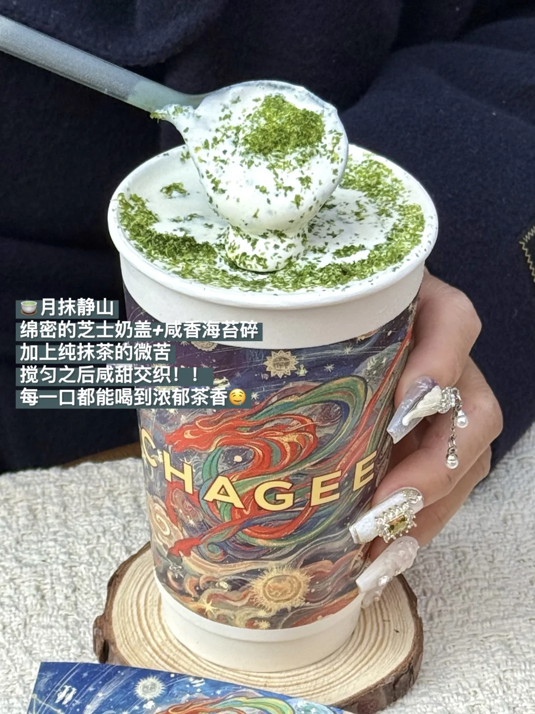 绵密的芝士奶盖撒上咸香海苔碎,加上纯正抹茶的微苦,搅匀之后咸甜交织!每一口都能喝到浓郁抹茶香,越喝越有瘾!