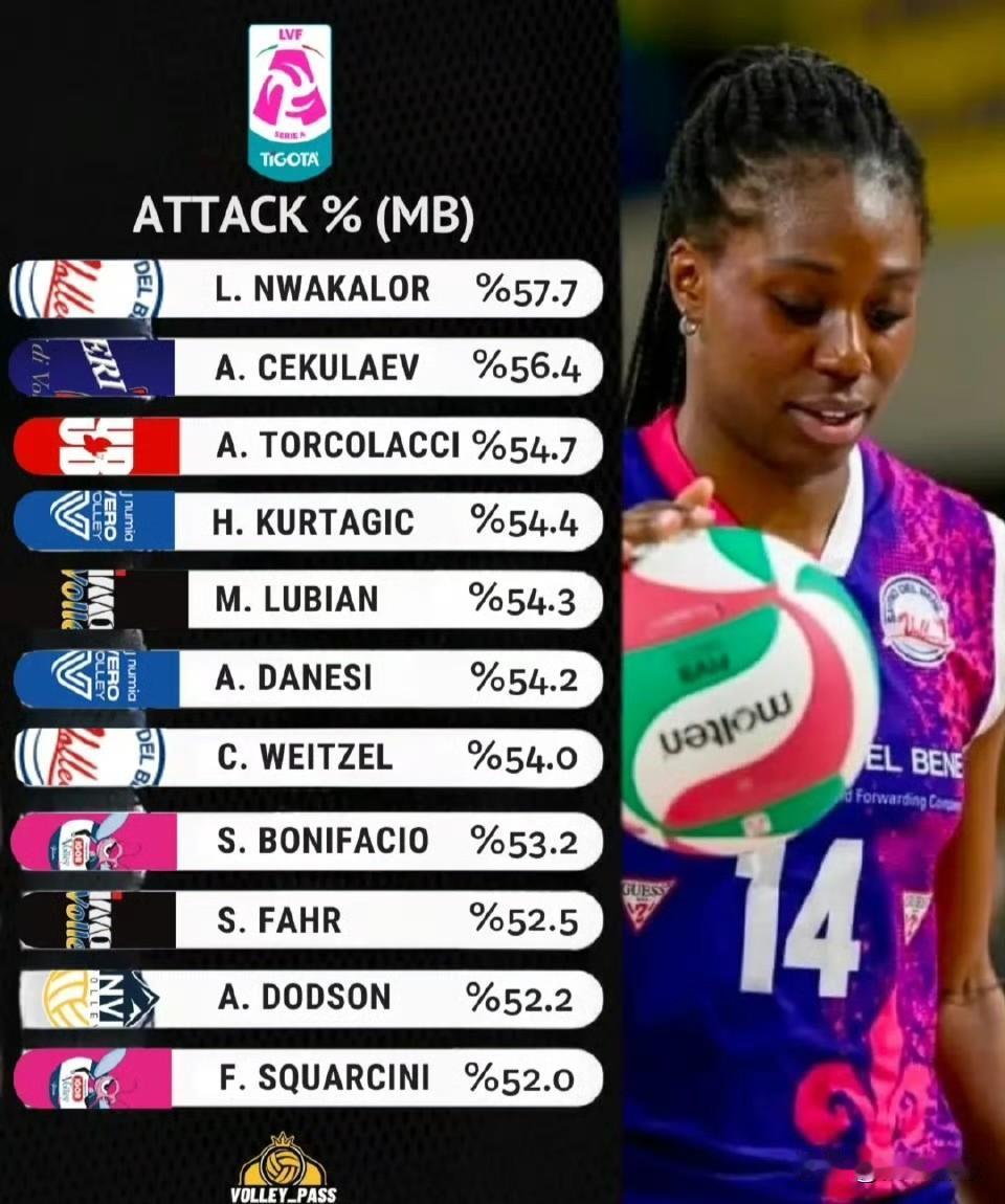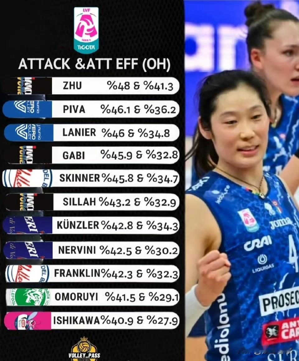 2025-2026赛季意甲女排联赛常规赛技术榜单已全面出炉,中国球员朱婷和庄宇珊