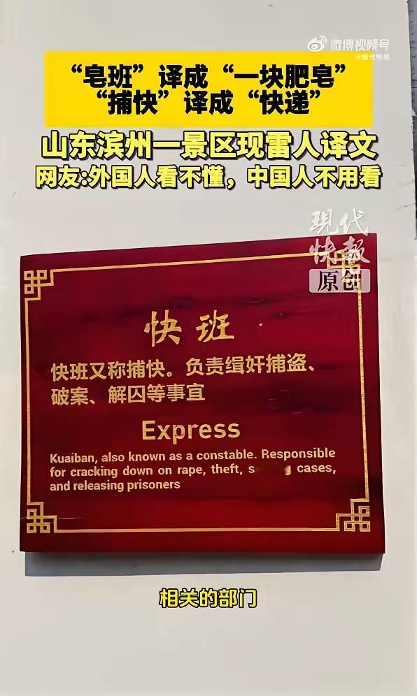笑喷!滨州无棣古城4A景区现“神翻译”:皂班=肥皂,快班=快递 近日,有游客反映,山东滨州无棣古城4A景区内出现雷人英文翻译:县衙“皂班”被译成“Soap Bar(肥皂)”,“快班”被译成“Express(快递)”,引发网友热议和吐槽。 据了解,“皂班”因差役穿黑色衣袍得名,并非“肥皂”;“快班”即捕快,负责缉捕等事务,并非快递。 2月23日,景区工作人员回应称,已将情况反馈相关部门核实,若确有错误将立即整改。无棣古城为国家4A级景区,历史悠久,保留多处古遗迹,是鲁北历史文化风貌的重要代表。 来源 综合现代快报等