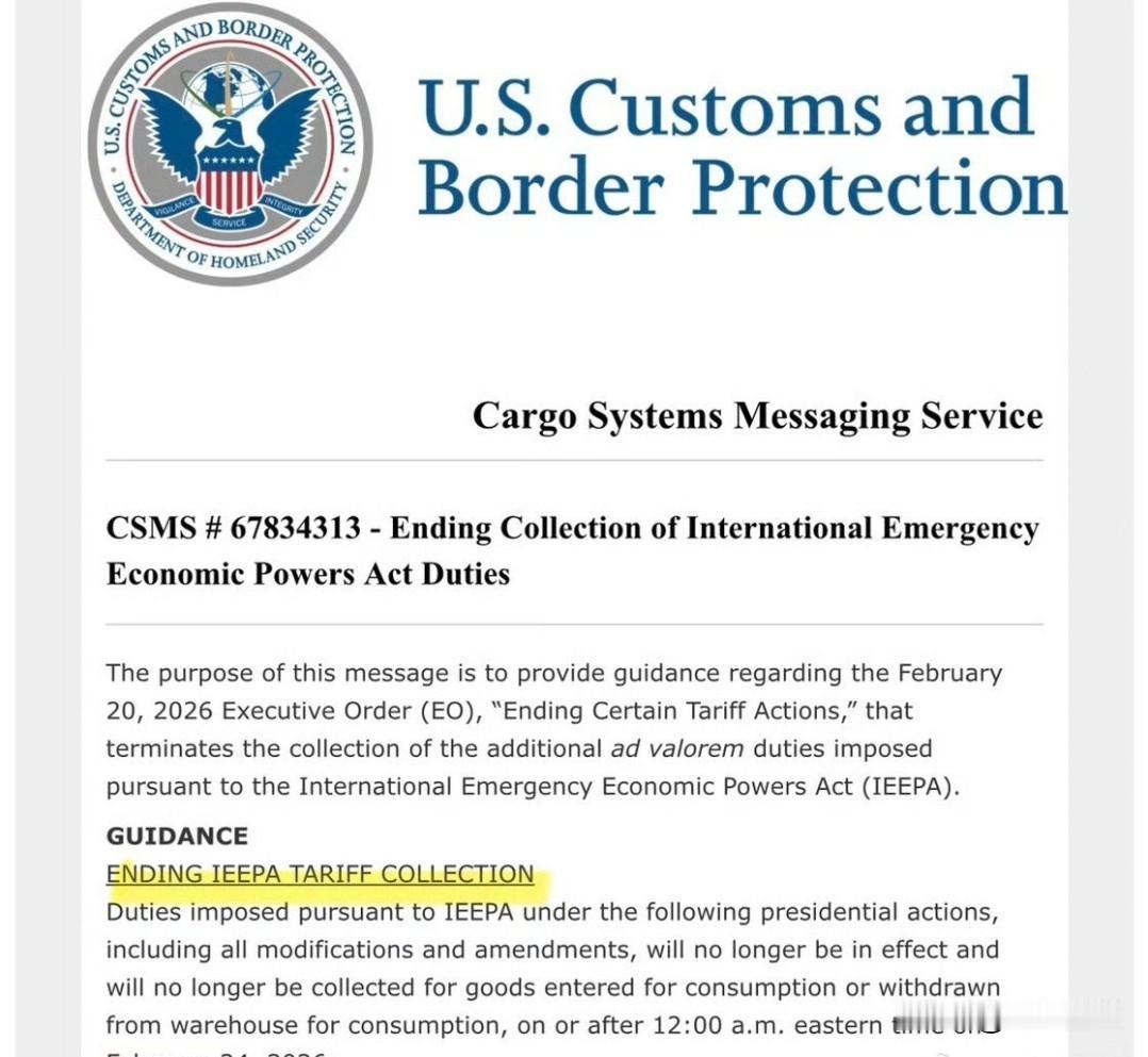 美国海关,正式发文:结束征收“经济紧急状态”关税(图一) 但同时“额外征收”的全球关税,文件显示的是10%,不是15%(图二) 因为10%有行政令,15%只有总统推文 此前美国联邦最高法院裁定其基于《国际紧急经济权力法》的关税违法,涉及金额超1750亿美元。特朗普还曾暗示关税不退,称这事得打好几年官司。 后续美国政府还会确定新的关税措施。这一系列操作,无疑给全球贸易局势又添了几分不确定性。