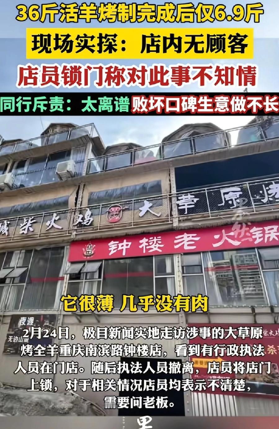 重庆6.9斤烤羊店老板,九零后,自称涛哥,在重庆九区开了四五十家餐饮店,看事发店规模很大,一个店至少投资100万,可见老板资产四五千万,一只36斤的活羊,直接榨取顾客四五百元,一天多少钱? 可见发家致富是有原因的,目测涛哥最多高中毕业,敢想敢干,混社会的高手,可是出来混早晚是要还的,碰到一个较真的,现在曝光了,店也关了,不关门?其他店还能开下去?警示所有商家!