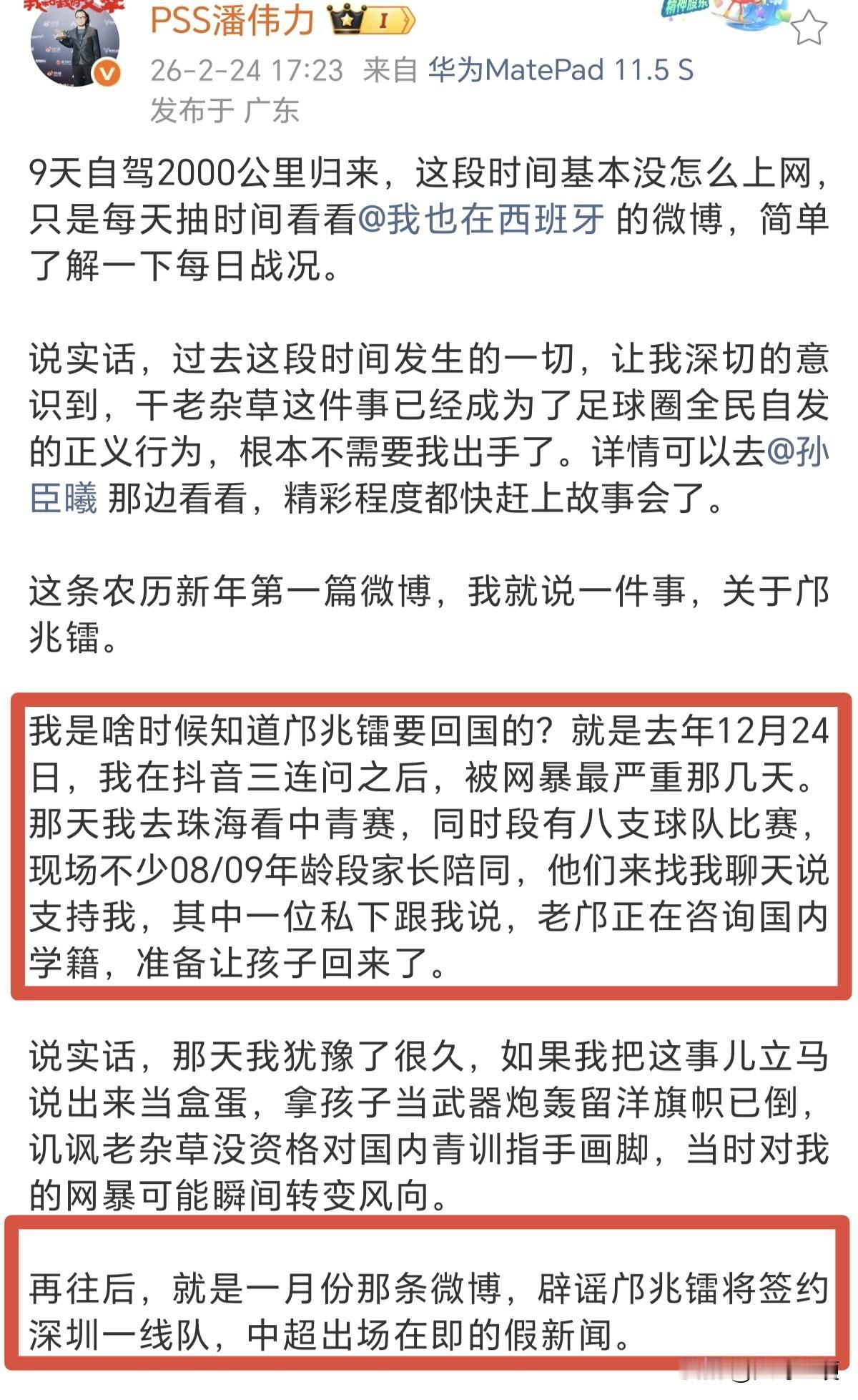 关于邝兆镭,媒体人潘伟力再爆猛料!早在去年12月下旬就知晓邝兆镭准备回国[震惊] 北京时间2月24日,知名足球媒体人潘伟力发文,详细解释了关于邝兆镭回国的时间节点以及辟谣加盟深圳队的细节[吃瓜群众] 一、知晓邝兆镭回国时间 文中,潘伟力表示,早在2025年12月24日,潘伟力去珠海观看中青赛,现场有多位08/09年龄段家长陪同,其中一位家长私下跟潘伟力说,老邝正在咨询国内学籍,准备让邝兆镭回来了。但潘伟力出于保护孩子的想法,犹豫再三当时并没有把这个盒蛋放出来…… 二、关于辟谣邝兆镭将签约深圳一线队,中超联赛出场在即的假消息 潘伟力表示,当时这条辟谣是经过深圳俱乐部CEO、外籍青训总监以及一线队主帅等人的多方交叉信息验证,并欢迎任何人质疑乃至起诉[强] 由此可见,潘伟力的这个信息源还是非常准确的,经得起考验的[加油] 最后,潘伟力再次强调,在国内足坛,在足球媒体人眼里,是没有任何信息差的,没有他们了解不到的事。不管是训练状态,比赛能力,教练和队友评价,只要想问,只要想说,有的是素材。对于邝兆镭,潘伟力暂时决定,不评价,让孩子安心踢球,让他从风口浪尖下来,无论他未来表现好坏,潘伟力绝不主动拿他当武器[作揖] 但潘伟力也发出郑重警告,如果再拿小球员扔过来当盾牌,就别怪足球媒体人出手狠辣了,到时候丢人现眼就别怪别人了,纯属自找的[苦瓜]