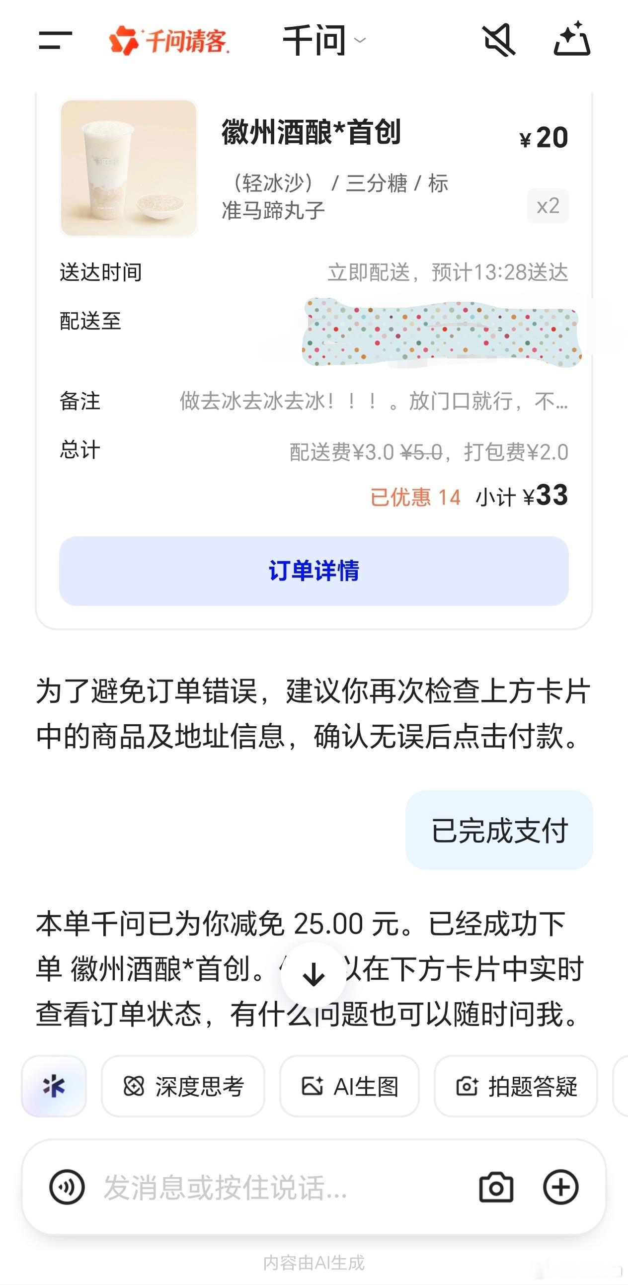 今天开工第一天,我还有免单卡,25元立减,直接用千问APP点了两杯奶茶,美滋滋哈哈。当然不光是点奶茶,买日用百货、电影票门票之类的都行。话说千问是真的挺好用的,平时工作和生活上有什么问题都可以找千问,超级方便。