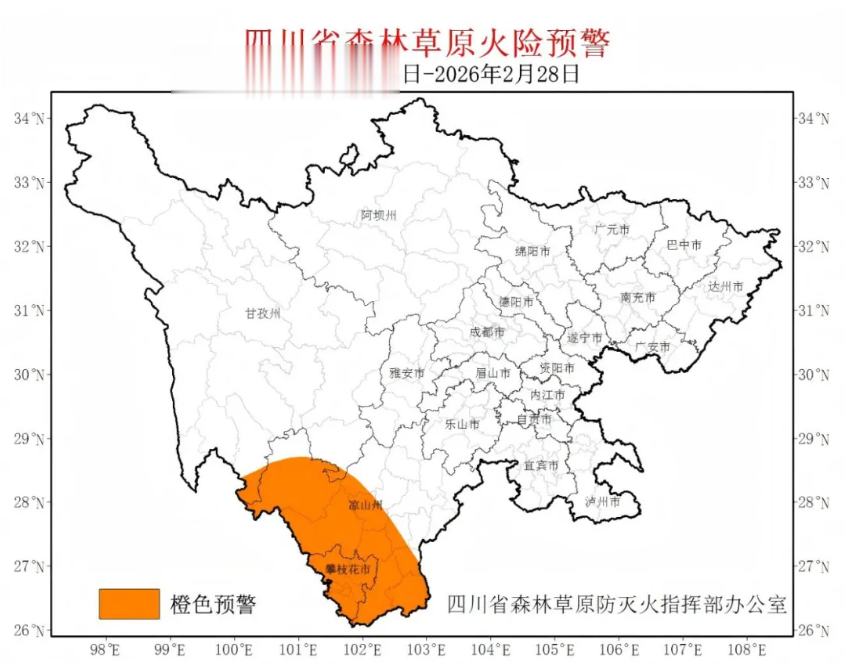 2月24日,记者从四川省森林草原防灭火指挥部办公室获悉,经该办公室与省林草局、四川省气象局及相关地方会商研判,预计2月24日—28日,攀枝花市,凉山州中部南部、西北部(涉及12个县级行政单位,具体范围见下图)森林草原火险等级将维持在高度危险级别,特发布高森林草原火险橙色预警。