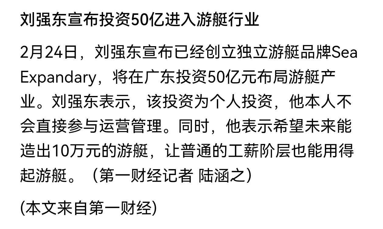 刘强东宣布投资50亿进入游艇行业! 这是继京东外卖后, 刘强东再次重磅出击,要打造出10万元的游艇!让普通的工薪阶层也能用得起游艇。目前已经在广东独立成立了一个游艇品牌,如果能做成的话,将是国内乃至世界上首创,把游艇价格打下进入到普通人生活中的!京东集团现在的业务也是很庞大,涉及多个行业领域,也走向了扩大的深耕的路子。