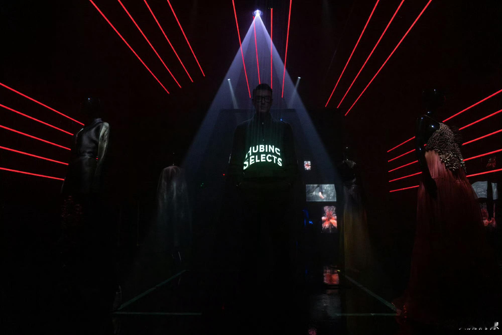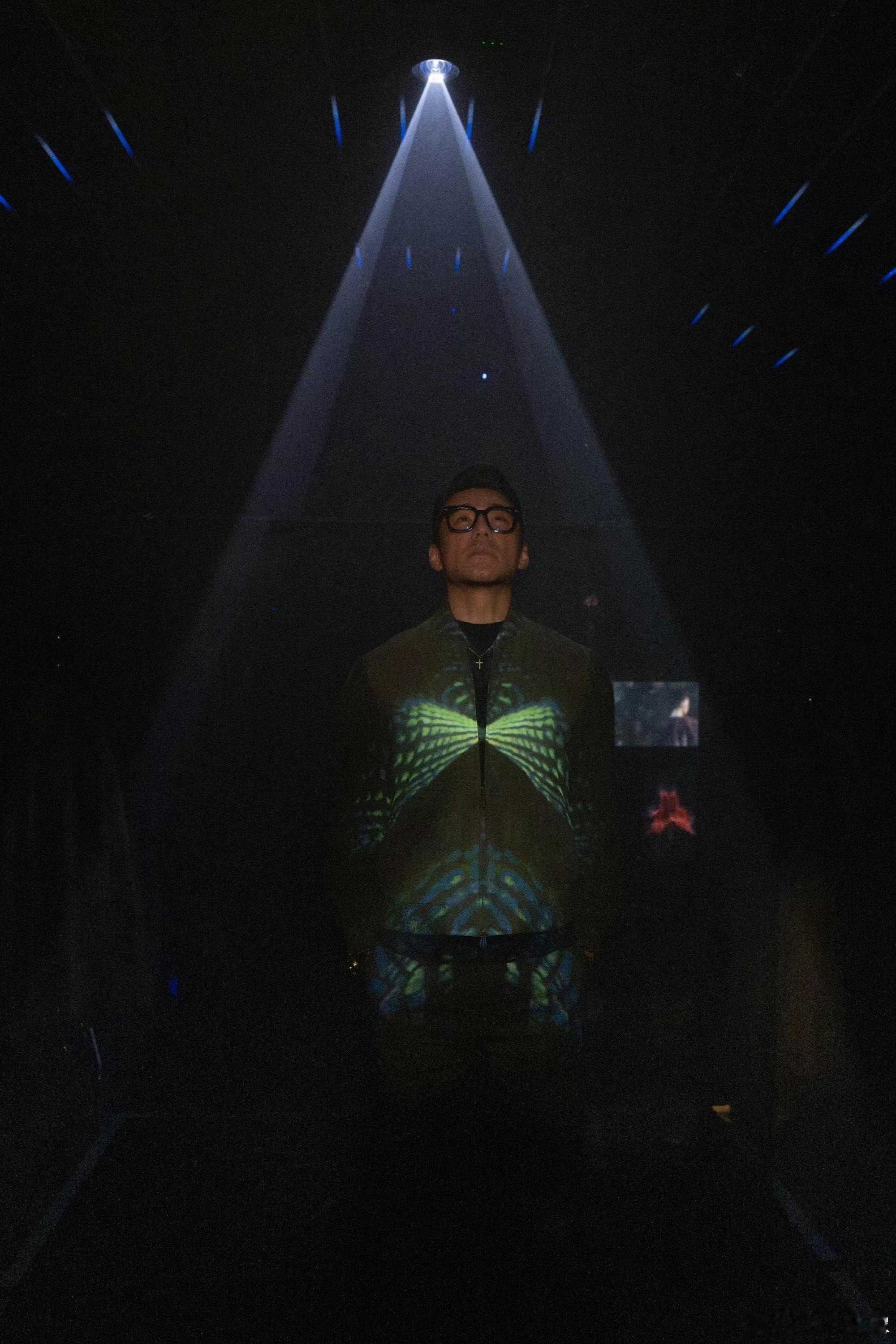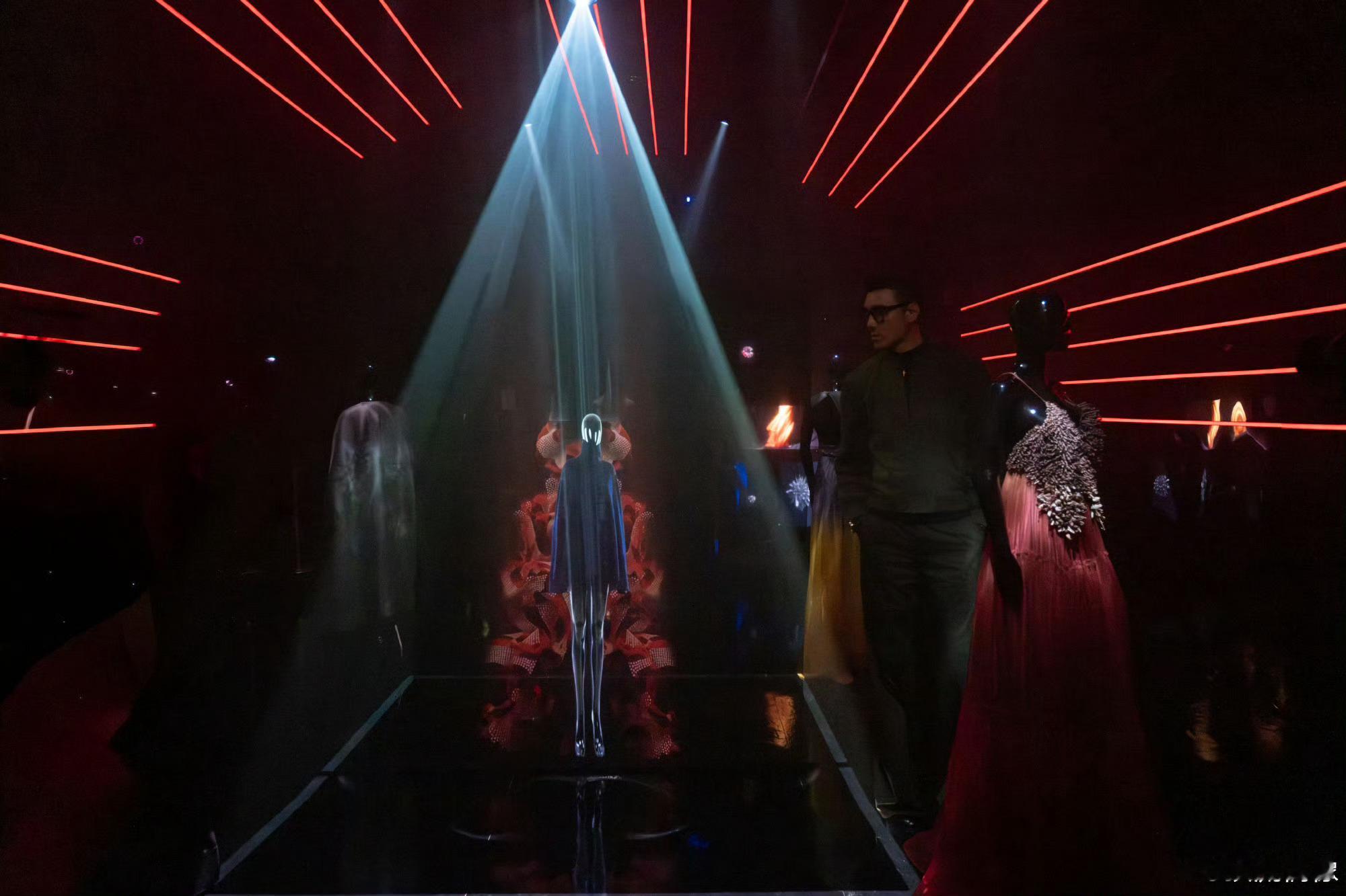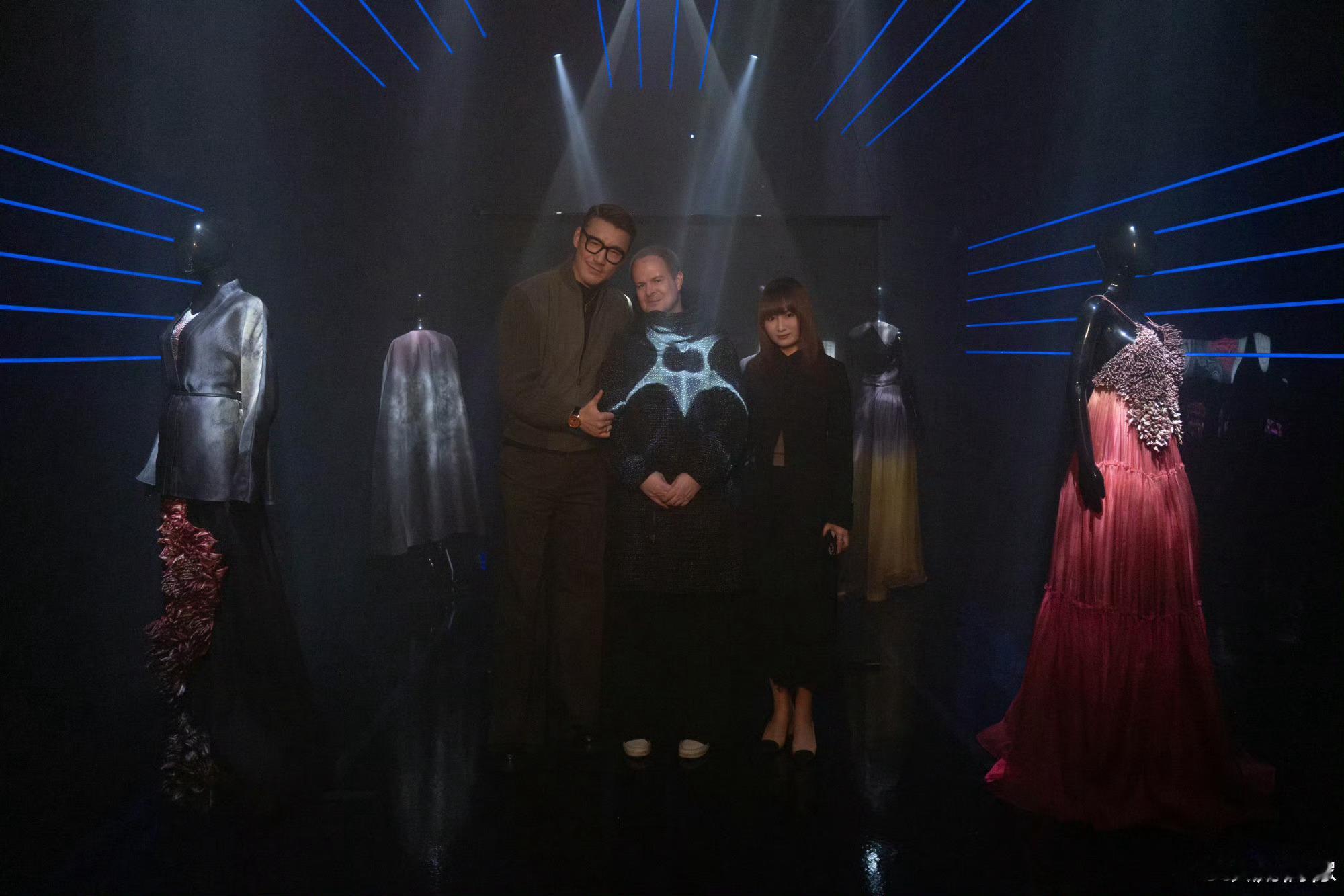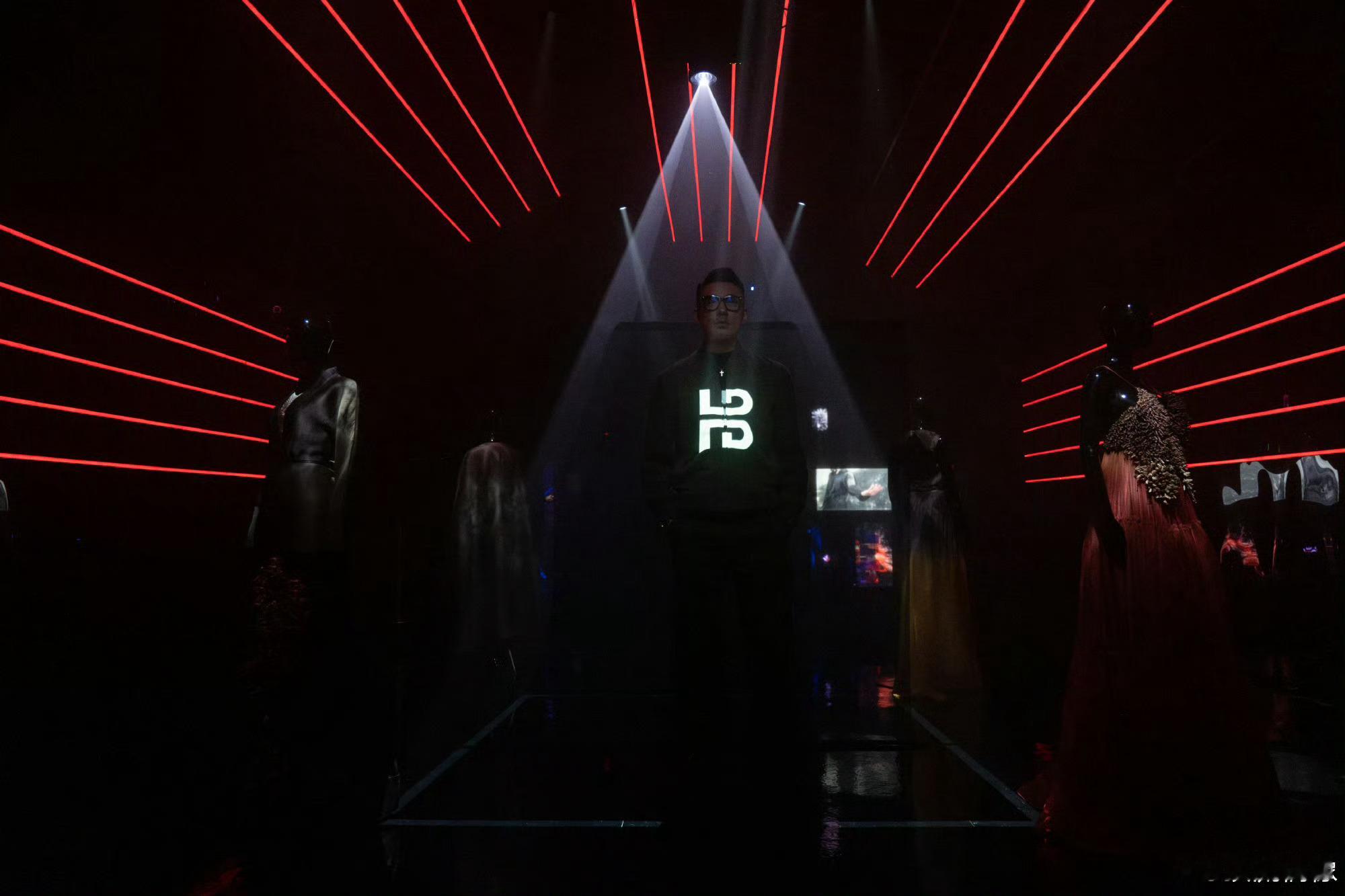 这个秀场太牛了!胡兵在伦敦打造赛博非遗秀场,空间内六套实体造型静立于光影之间,作品将白族非遗扎染技艺与3D打印技术有机融合。而每一件服装身旁,都平行存在着一件不断演化的“数字孪生”作品——它并非传统意义上的视频或动画,而是基于 Touch Designer 将物理扎染逻辑转化为参数化关系的生成式数字有机体,始终处于持续演化之中。太酷了!hello时装周
