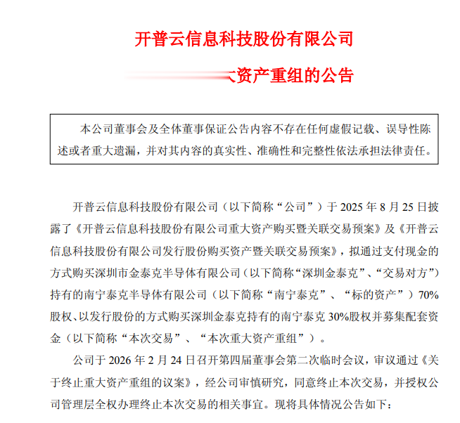 2月24日,开普云(688228.SH)公告称,此前公司公告,拟向交易对方深圳金泰克收购其全部存储产品业务,具体方案为深圳金泰克将其存储产品业务的经营性资产下沉转移至其全资子公司南宁泰克。2月24日公司第四届独立董事专门会议2026年第一次会议审议通过《关于终止重大资产重组的议案》。
