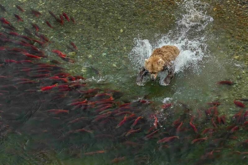 除海洋题材外,摄影师还在美国卡特迈国家公园拍下震撼一幕:一头体型庞大的棕熊站在湍急河流中,张口咬向跃起的红鲑(Sockeye salmon)。画面精准定格顶级掠食者捕猎瞬间,生动展现极端自然环境下的生存竞争与力量张力。
