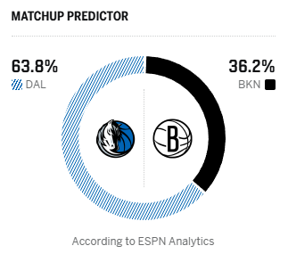 ESPN预测明日比赛:独行侠胜率63.8%,篮网胜率36.2%