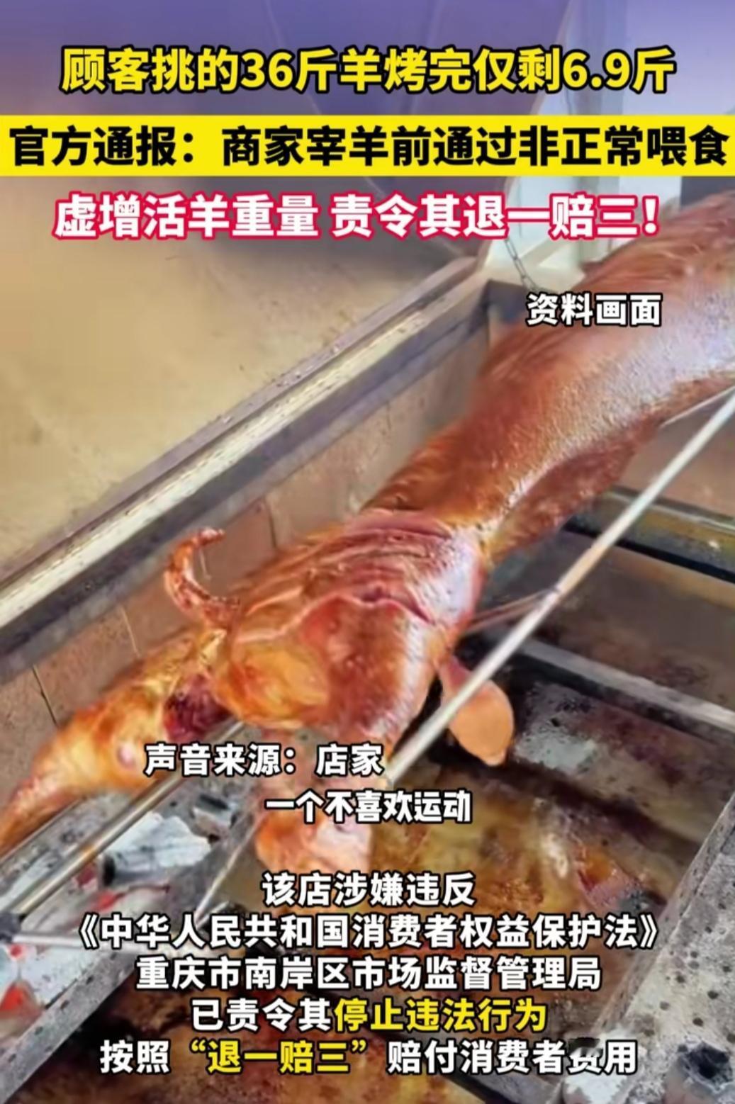 谁能想到吃顿烤全羊竟踩了大雷!36斤的活羊端上桌,烤完居然只剩6.9斤,这重量差直接惊掉食客下巴,任谁遇上这事儿都得心里犯嘀咕,好好的聚餐心情全被搅和了,换谁都咽不下这口气。 后续调查结果一出,原因更让人咋舌,涉事商家竟是在宰羊前搞小动作,靠非正常喂食硬生生给活羊增重,玩起了缺斤少两的猫腻,被监管部门当场查实,还被责令给消费者退一赔三,这波操作属实是搬起石头砸自己的脚。 而这起烤全羊事件,也只是消费乱象的一个缩影。不管是高价打包袋、商家反悔套圈奖品,还是直播间忽悠老人买佛像,各类消费坑层出不穷,不少人都有过类似的糟心经历,看似不起眼的小套路,实则寒了消费者的心。 花钱消费本是图个舒心,可偏偏总有商家动歪心思,靠着各种猫腻算计消费者。这些事儿也让大家警醒,面对消费中的不合理现象,多留个心眼的同时,也盼着能有更严的监管,让大家消费时能真正放点心。