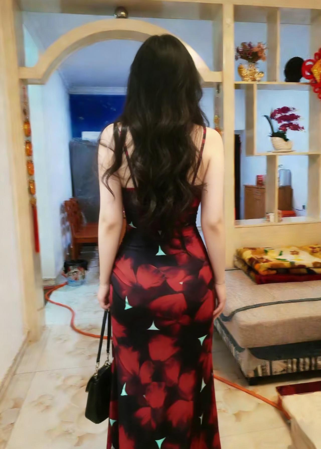 从卧室到客厅 从走廊到浴室 她的背影是一朵移动的花 在不同的空间里绽放 黑丝绒的花瓣 缀着细碎的星芒 ~ 她走过铺着瓷砖的地面 像一朵花在水面滑行 长发是流动的墨 裙裾是燃烧的火 在每一个房间里 都留下一抹不肯褪色的红 ~ 福字在墙上凝望着她 电视里的喧嚣与她无关 她只是安静地走 像一首诗在不同的段落里穿行 每一个转身 都让空间有了新的意义 ~ 洗衣机的嗡鸣是背景音 镜子里映出她的侧影 红裙在水汽里晕开 像一幅未干的画 她的背影 是这房间里最生动的诗行