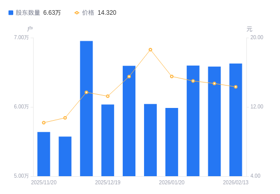 日期A股户数(户)流通A股户均持股数(股)户均持股市值(万元)2026-02-136627410734.2215.372026-02-106583410805.9615.902026-01-306597510782.8716.172026-01-205985711884.9918.452026-01-096041911774.4321.922025-12-316594510787.7716.732025-12-196035311787.1215.612025-12-106952910231.5314.012025-11-285571012769.4913.712025-11-205637612618.6312.85