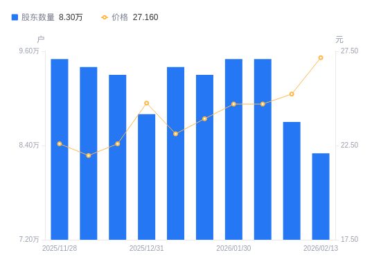 近一年(2025年2月20日至2026年2月13日),雅化集团A股股东户数从11.5万户,减低至8.3万户,降幅27.83%,区间股价上涨113.02%。