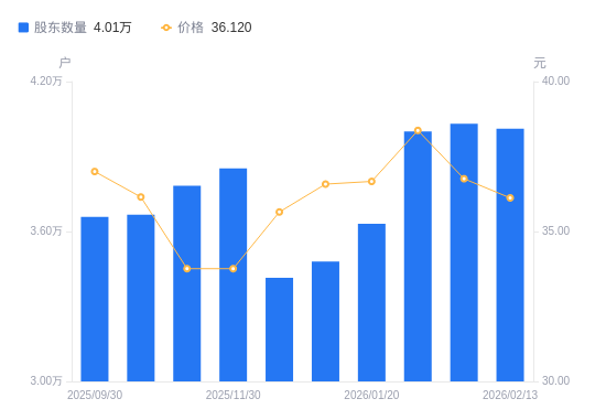 日期A股户数(户)流通A股户均持股数(股)户均持股市值(万元)2026-02-134011718089.5265.342026-02-104031318001.5766.172026-01-313999918142.8869.612026-01-203631019986.1573.292026-01-103479320857.5676.302025-12-313415121249.6675.762025-11-303852418837.5363.602025-11-203783219182.1064.762025-11-103667119789.4071.542025-09-303658719834.8473.39