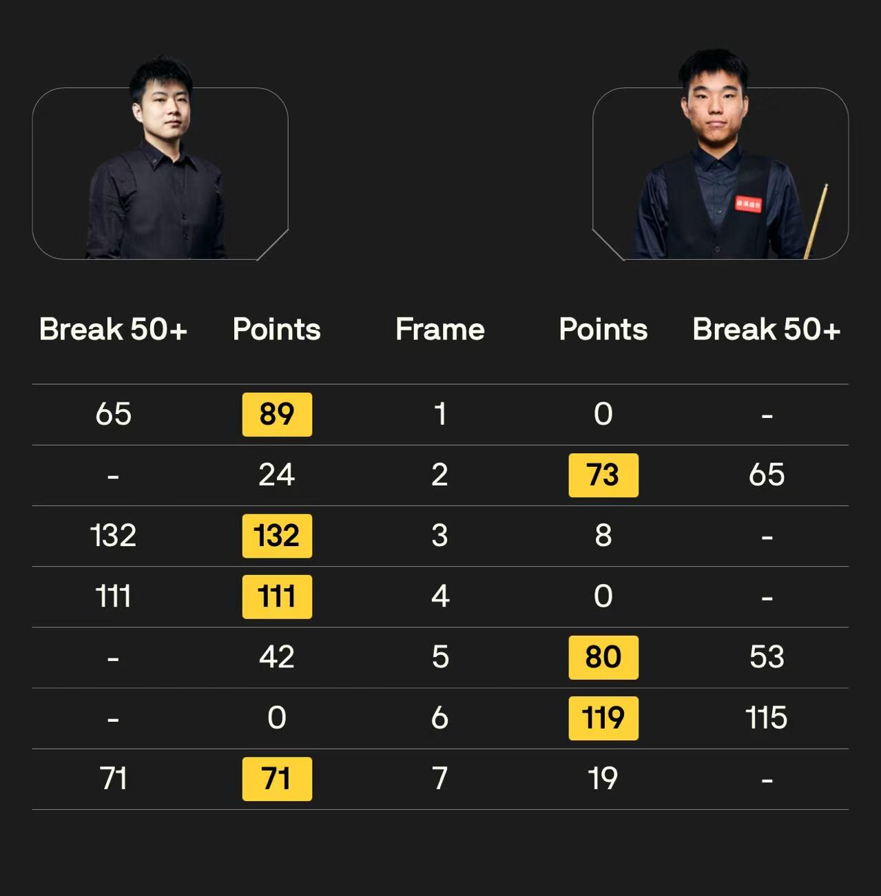 赵心童打出两杆破百(132、111)和两杆50+(65、71),范争一打出一杆破百(115)和两杆50+(65、53)