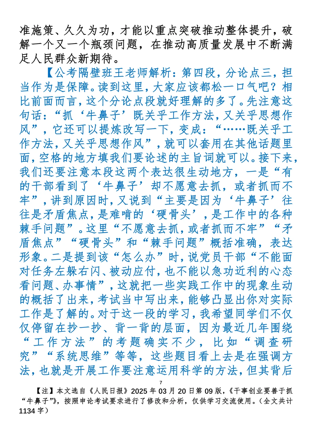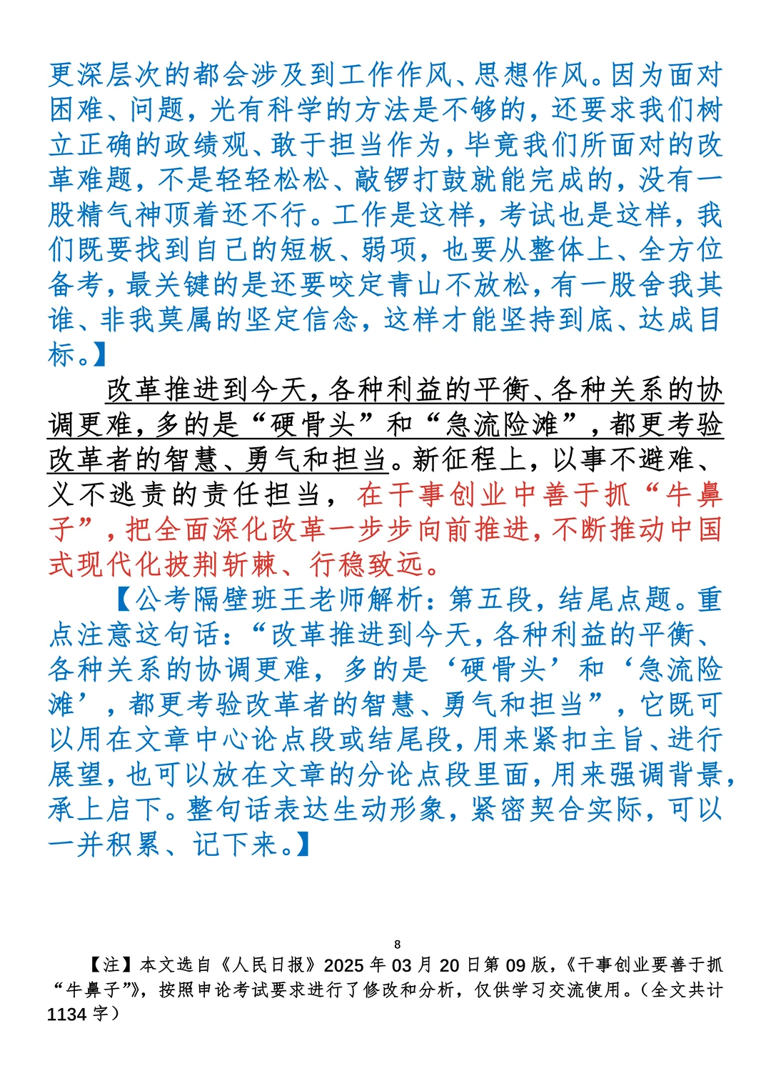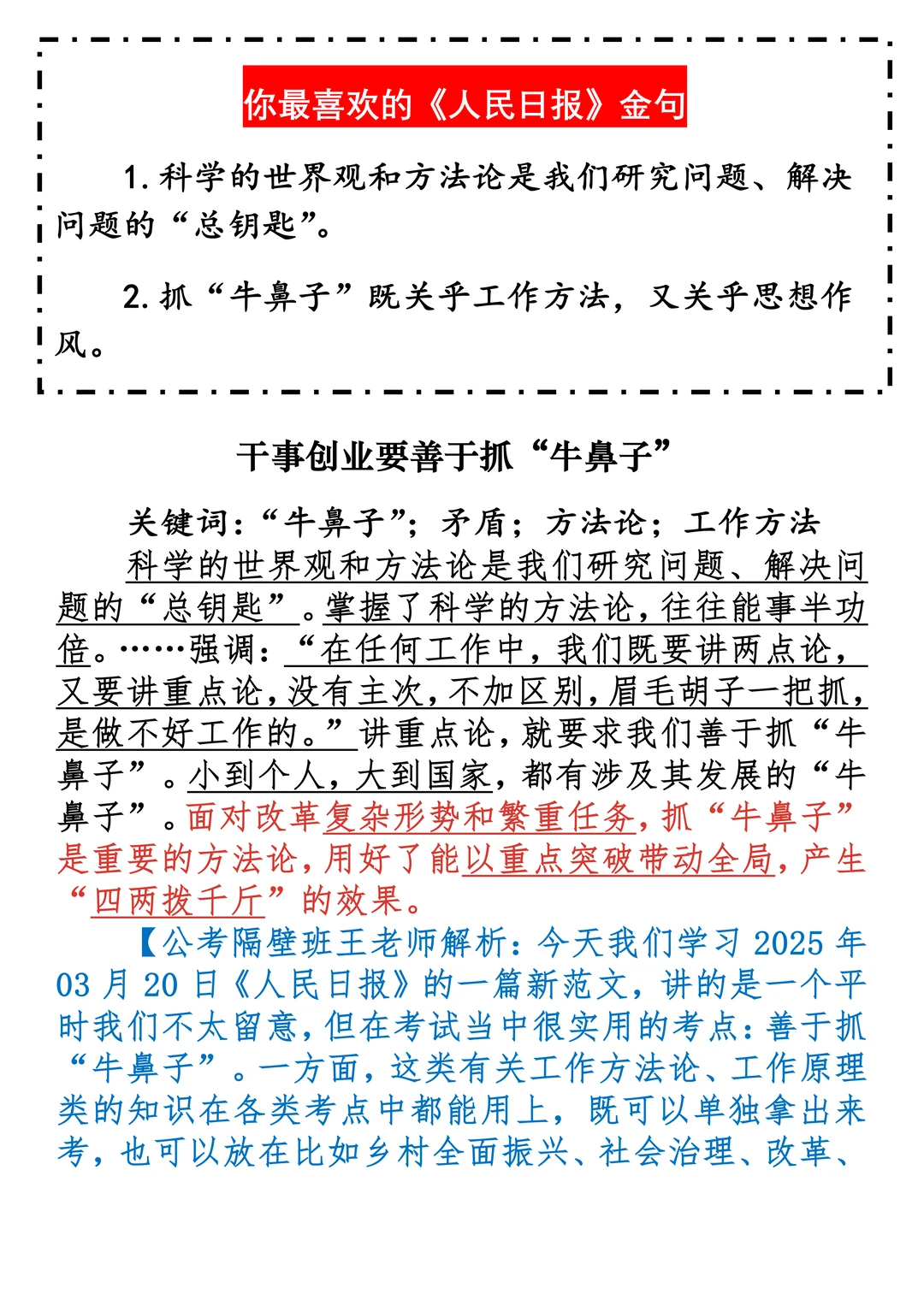 如何抄写:每日抄写文章发在“公考隔壁班王老师”账号,红色字是重点句和结构句,黑色字是正文,蓝色字是解析,大家抄写时不必抄蓝色字。建议先通读全文,做到心中有数再开始抄写,效果会更好。 关于文章:抄写文章来源于人民日报,但每篇文章我都根据申论考试要求进行了修改:一是重写或修改开头、结尾;二是统一段首句句式结构;三是调整段落字数,使文章结构更均衡;四是简化复杂长难句,使之更具可模仿性。每篇文章无论修改多少,都是基于申论考试要求,毫无对人民日报文章品评之意。(此处致敬人民日报)