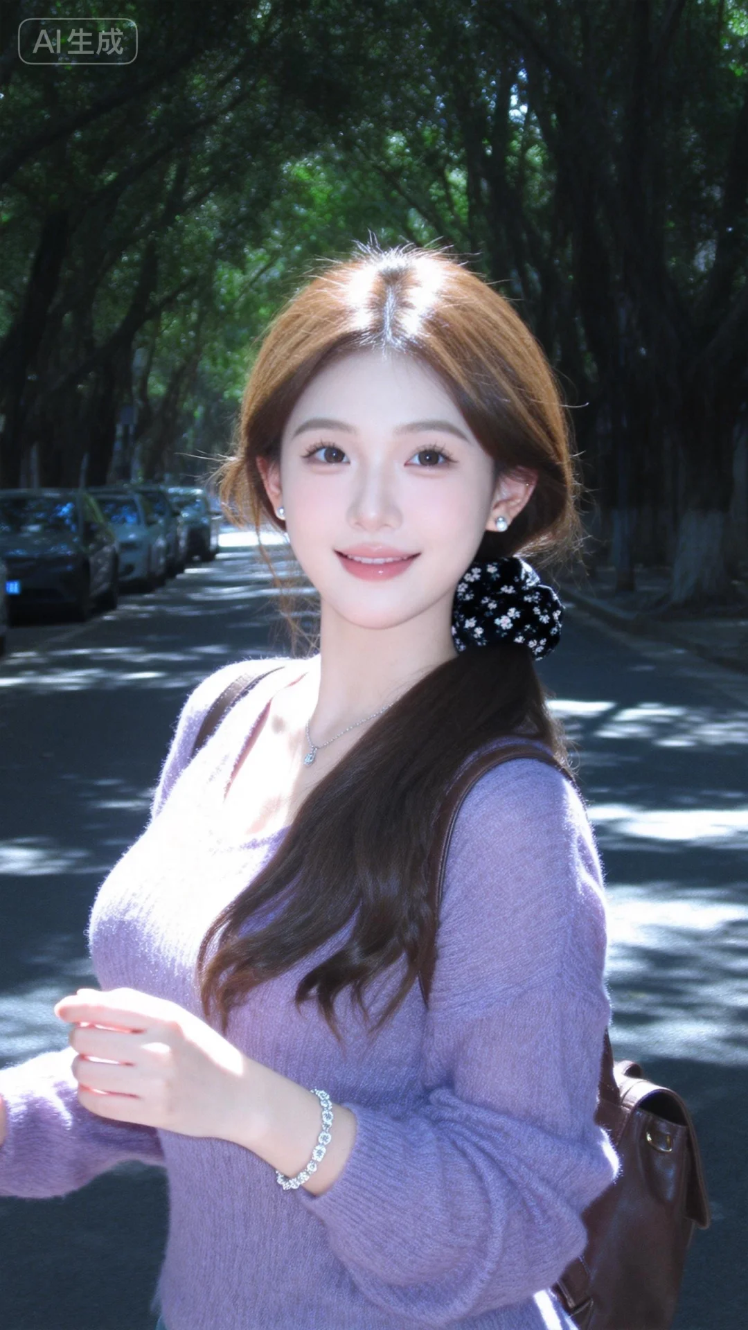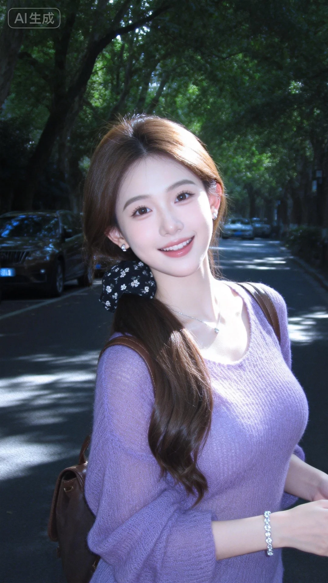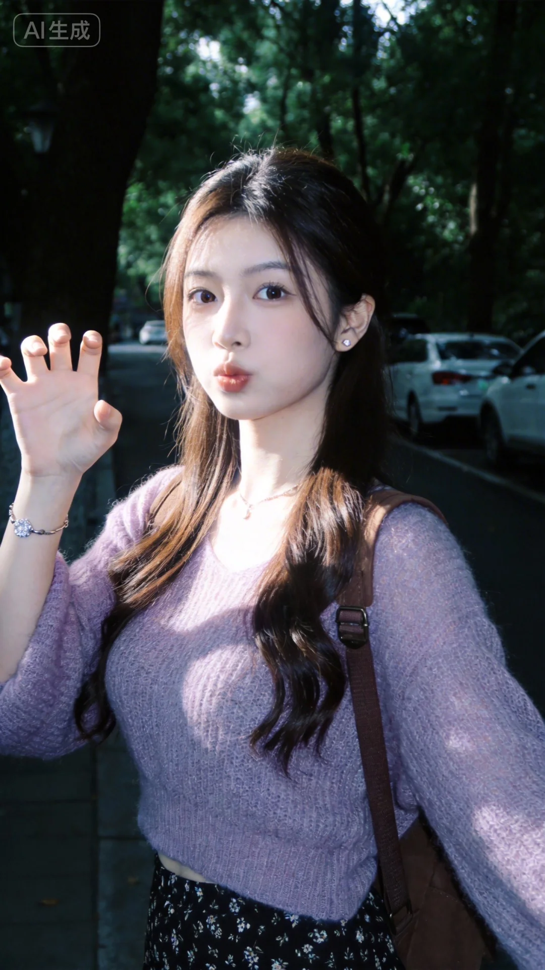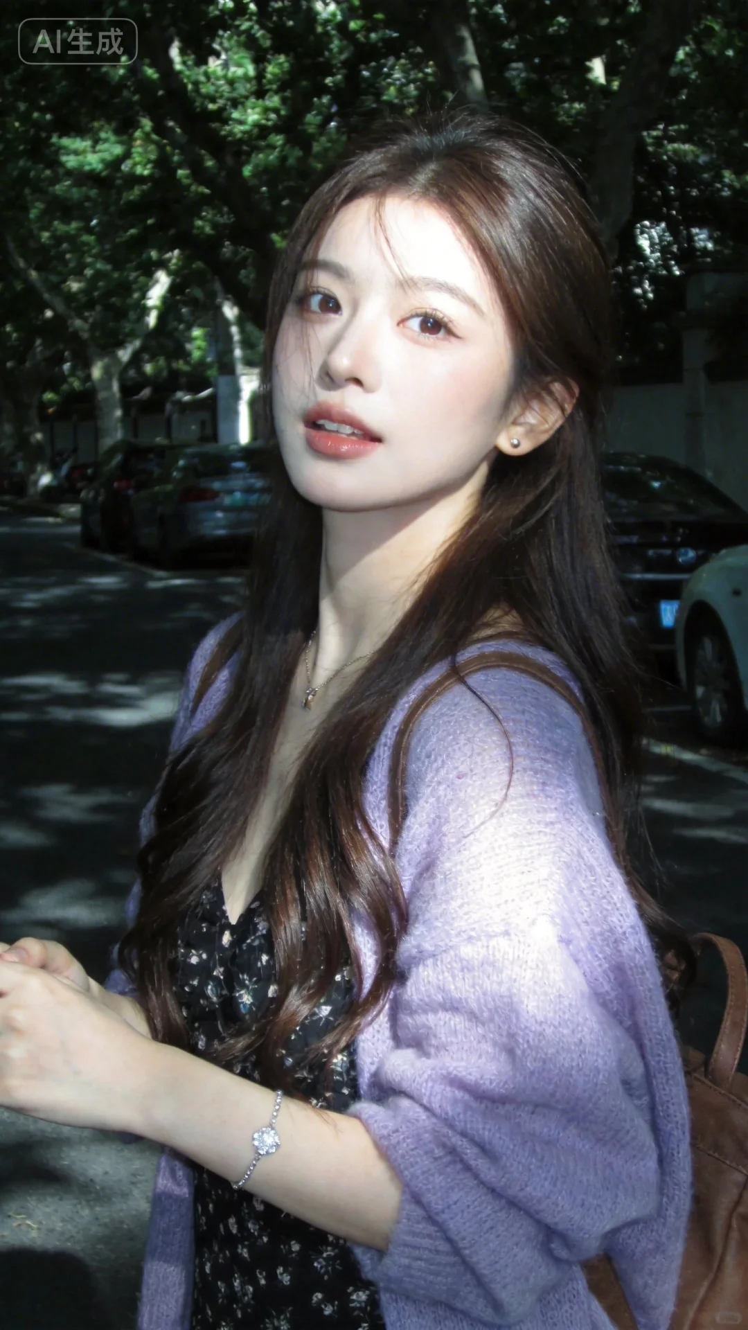 日常快照风格,皮肤白皙,底妆通透,肤色均匀自然,女生的发丝清晰可见,神情忧郁妖冶少女,冷白皮,纯欲风,黑色长发,细链项链,表情自然松弛,照片毫无修饰感,带有生活真实感。ccd拍照感,iphone实拍,特写构图,让整个构图充满了柔和的氛围感,|[人物] 葫芦型完美身材,三庭五眼瓜子脸,冰瓷玉肌冷白皮|眉清目秀,眼神自然灵动,做俏皮可爱表情|茶棕色随机偏分直卷发,发丝根根分明|佩戴极简耳钉、项链与钻石手链,一半明亮一半隐于阴影,光影斑驳,立体感极强|不均匀打光造成局部柔光过曝,暗调背景营造静谧层次|[风格] 日常快照纪实感,iPhone实拍结合CCD朦胧美学|慢快门捕捉舒展动态,画面带呼吸感|35mm定焦无畸变,冷色调高曝光,画面清新干净|[质感] 皮肤如羊脂玉通透莹润,底妆轻薄无瑕,肌理细腻可见|无噪点高画质,色彩柔和高級|[元素] 随机妆容、美甲、饰品、动作与光影视角,搭配合理不失惊喜|整体呈现空灵白月光氛围,故事感与情绪感染力满溢|极简唯美,偶像气质,竖向构图|在户外林荫街道场景(绿树成荫、停靠的车辆、斑驳光影)中,身着质感轻柔的温柔风紫色薄款针织衫宽松毛衣,黑色碎花长发。帮我弄一个适合这套服装的发型。搭配棕色的双肩包。她肢体动作自然协调,神态表情真实细腻,光影下的脸部细节灵动清新。画面光线自然柔和,阴影层次细腻,服装质感轻薄且富有纹理,整体呈现出随性又精致的夏日氛围感,尽显甜美灵动的少女气息。”