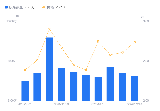 日期A股户数(户)流通A股户均持股数(股)户均持股市值(万元)2026-02-107250024860.766.812026-01-317400024356.826.362026-01-207700023407.856.042026-01-107200025033.406.882025-12-317300024690.485.902025-12-207470024128.585.912025-11-307660023666.016.322025-11-109200019704.525.732025-10-317400024497.526.152025-10-207000025897.386.19