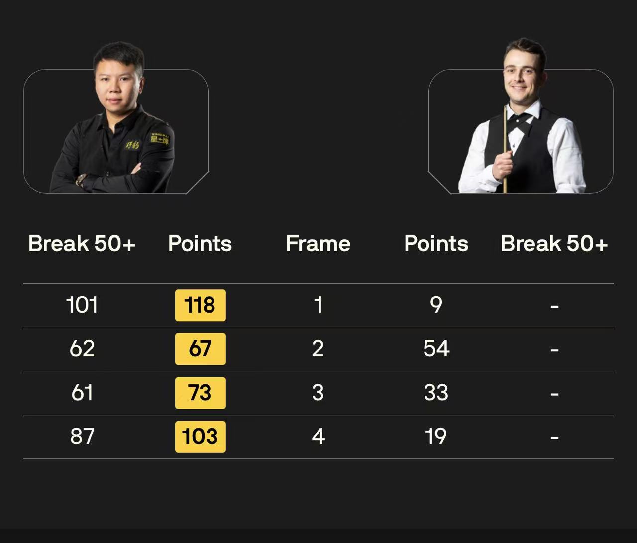 周跃龙全场比赛打出一杆破百(101)和三杆50+(62、61、87),连胜四局以4-0的比分战胜亚历山大-乌尔森巴赫晋级32强