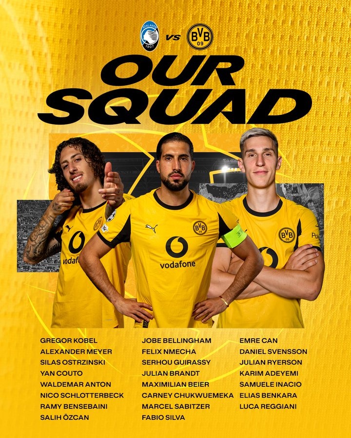 直播吧2月24日讯北京时间本周四凌晨1点45,欧冠1/8决赛附加赛次回合多特将客战亚特兰大,多特公布了此役球队大名单,此前腹股沟受伤的埃姆雷·詹、肌肉受伤的施洛特贝克在列。