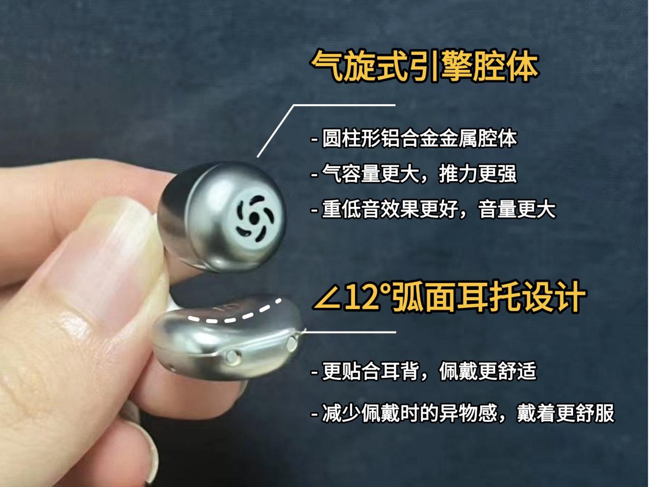 音质做了三重升级,听感直接能跟千元耳机比一比。喇叭用的是 13mm 双磁单元,靠两个高精度叠加的磁铁加强磁场,不仅声音更清楚,音量也更够劲;还有气旋式引擎腔体技术,做成了圆柱形的铝合金金属腔体,能有更多的气流,能有更大的劲去推动声音,重低音特别震撼;再加上石墨烯科技振膜和虹觅声学实验室的调音,整体音质很稳很清晰,表现非常好。在 500 块以下的耳夹式耳机里,它的音质表现真的数一数二。