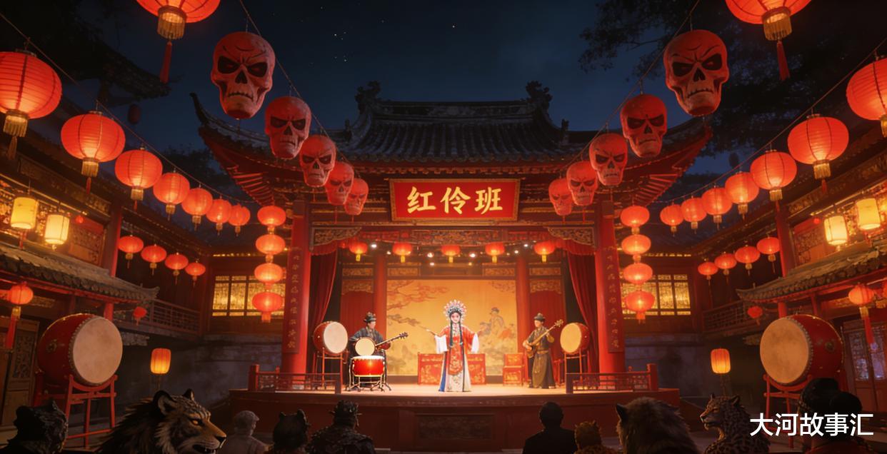 次日夜,鼓楼街的“红伶班”戏院灯火通明,红灯笼高挂,像一串串待斩的人头,在风中轻轻晃动。锣鼓喧天,丝竹悠扬,台上演的是生死离合,台下坐的是豺狼虎豹。