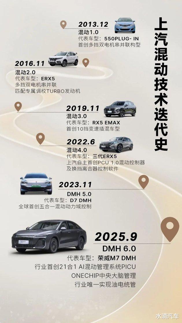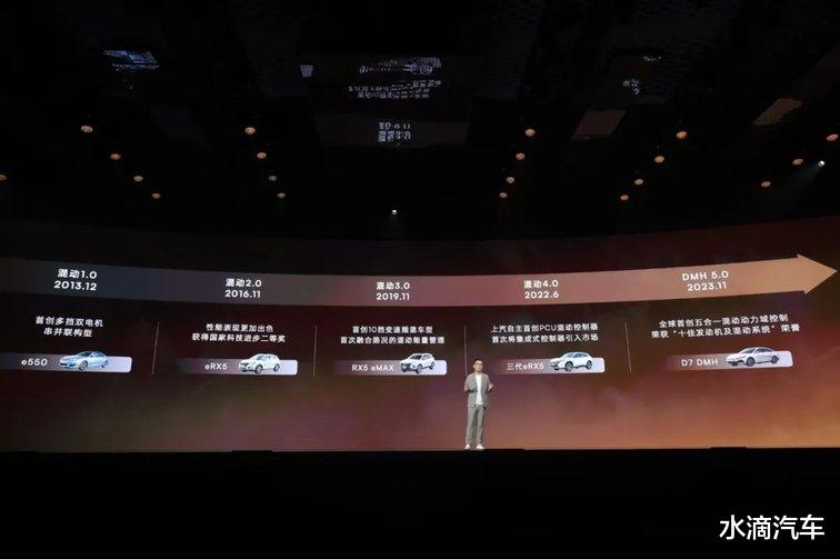 随着电池密度和电机技术的突破,2022年,上汽第一时间革新混动技术,在第四代混动系统中应用了先进的P1+P3单挡模式,跳开传统变速箱直驱,更高效、更简洁地降低了能耗,并将集成式控制系统配置到第三代荣威eRX5上,更擅长软件集成的仇杰开始领衔上汽的混动研发。2023年,上汽将自己的第五代混动技术命名为DMH,对外传播叫作“大美好”。这一年,上汽第五代混动技术将首创的5合1混动域控制器配置在荣威D7 DMH上。