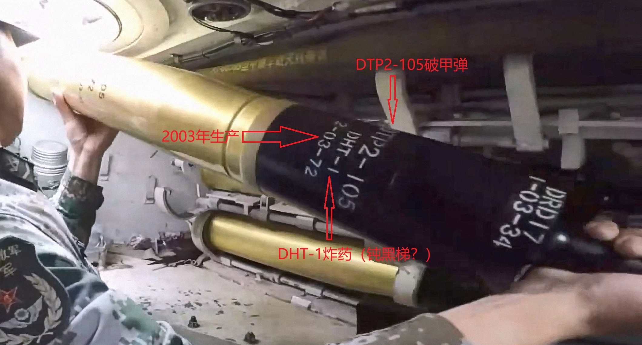 05两栖突击车105炮配备的DTP2-105破甲弹,装填DHT-1炸药,2003年生产,DHT-1可能是钝黑梯-1的缩写,查到的钝黑梯-1炸药成分:59.5% RDX+39.5% TNT+1%地蜡(钝感剂),这是种以TNT为载体的熔铸炸药,钝化的梯黑炸药,和B炸药成分差不多?