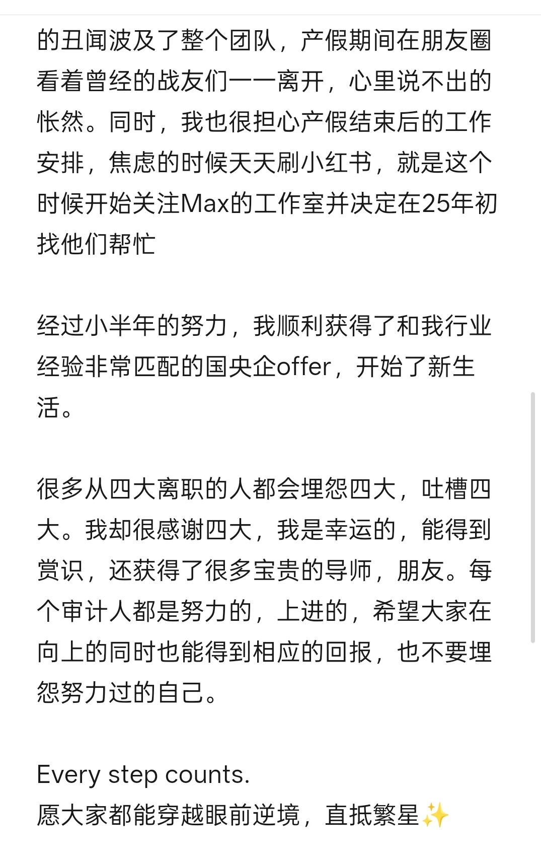 很多从四大离职的人都会埋怨四大,吐槽四大。我却很感谢四大,我是幸运的,能得到赏识,还获得了很多宝贵的导师,朋友。每个审计人都是努力的,上进的,希望大家在向上的同时也能得到相应的回报,也不要埋怨努力过的自己。
