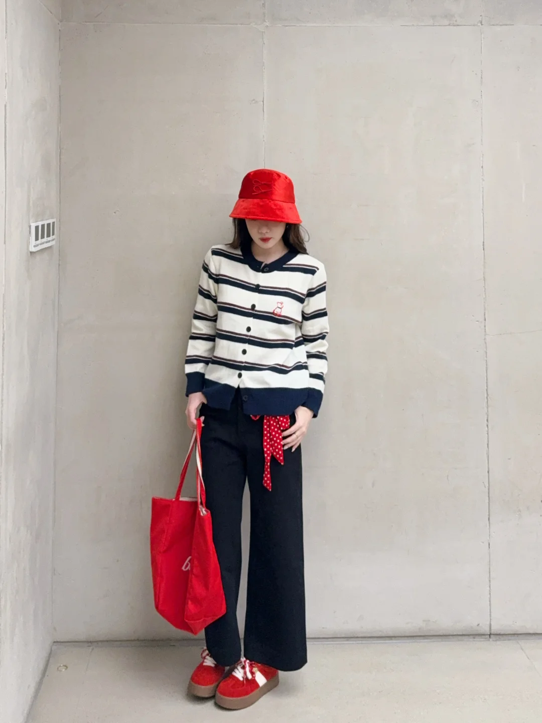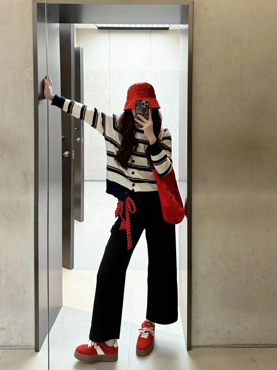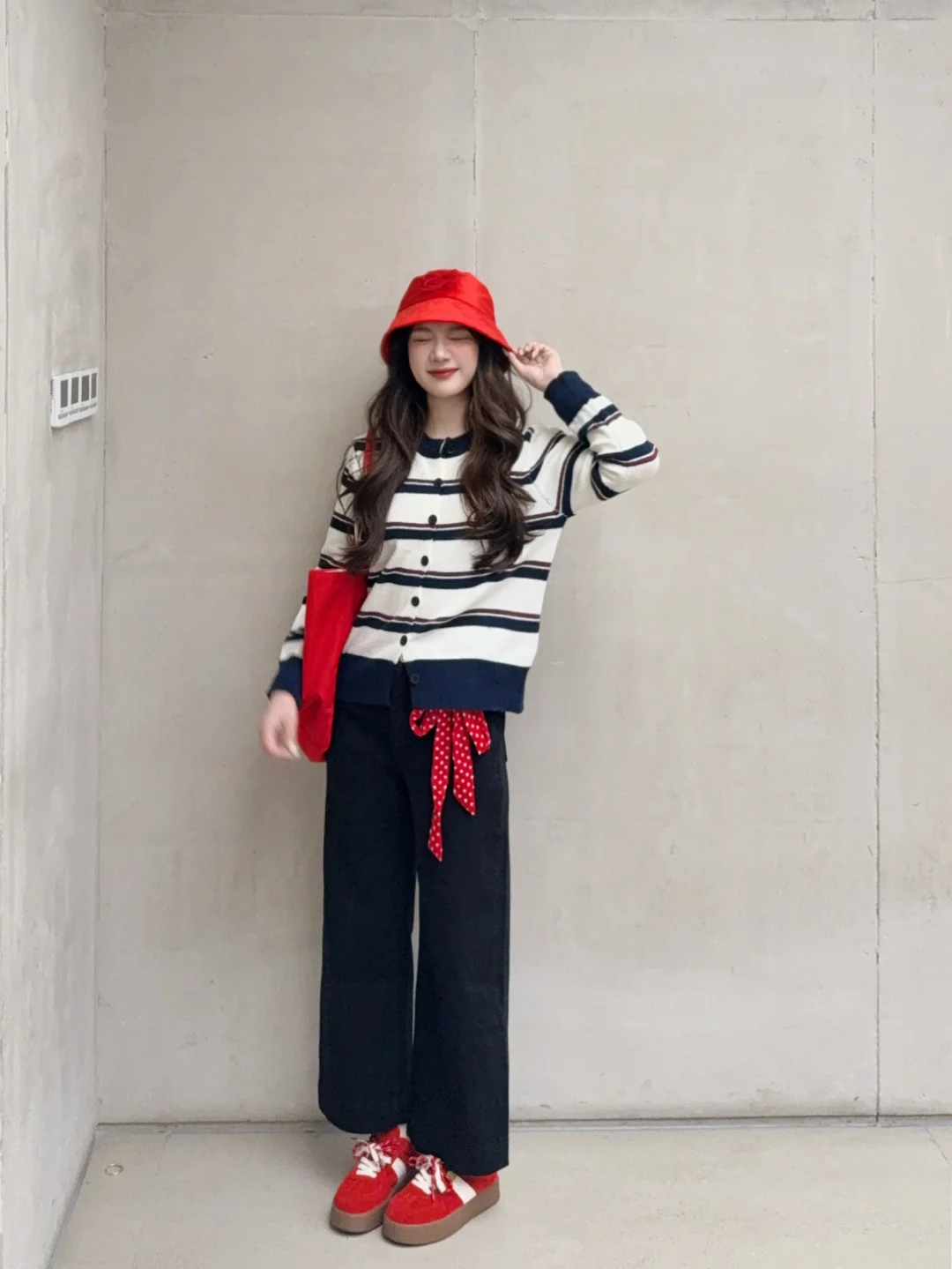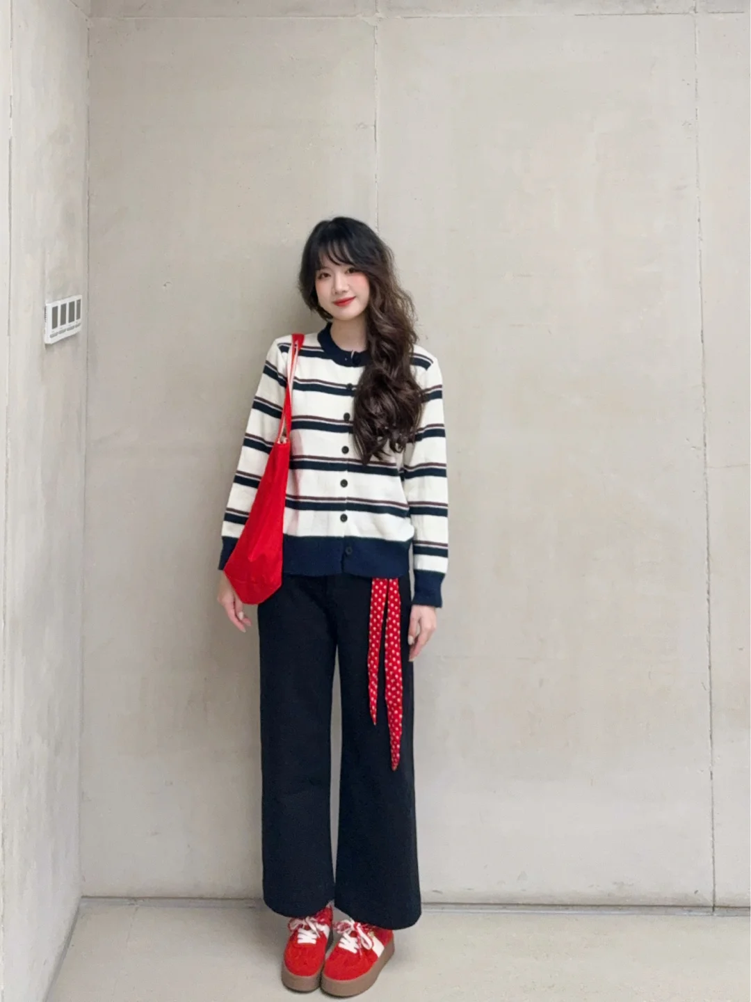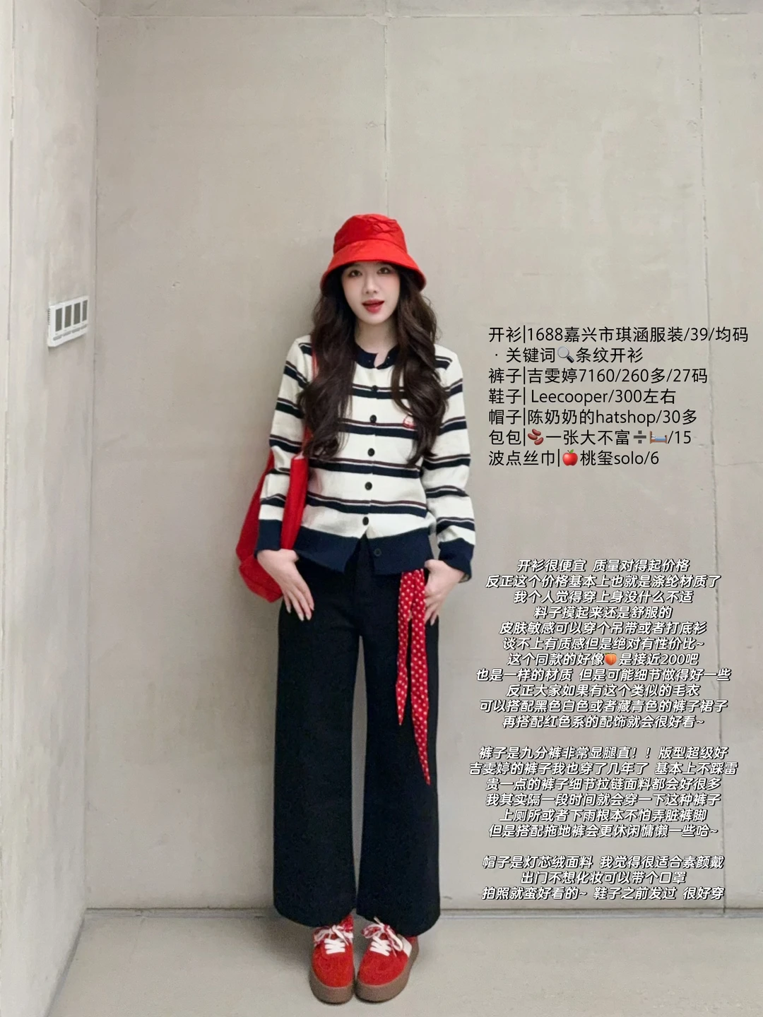 168/106 纯分享 理性种草~ 一套日常又带点miu感的搭配 最近这个条纹开衫还蛮火的 单穿或者当内搭都挺好看的~ 可以搭配蓝色黑色卡其色藏青色的下装(裙子裤子都可以) 想要更慵懒一些可以搭配拖地裤 配饰搭配红色比较出彩~ 这套应该没人会说裤脚弄脏了吧哈哈哈 九分裤真的很利索 看起来腿很直~